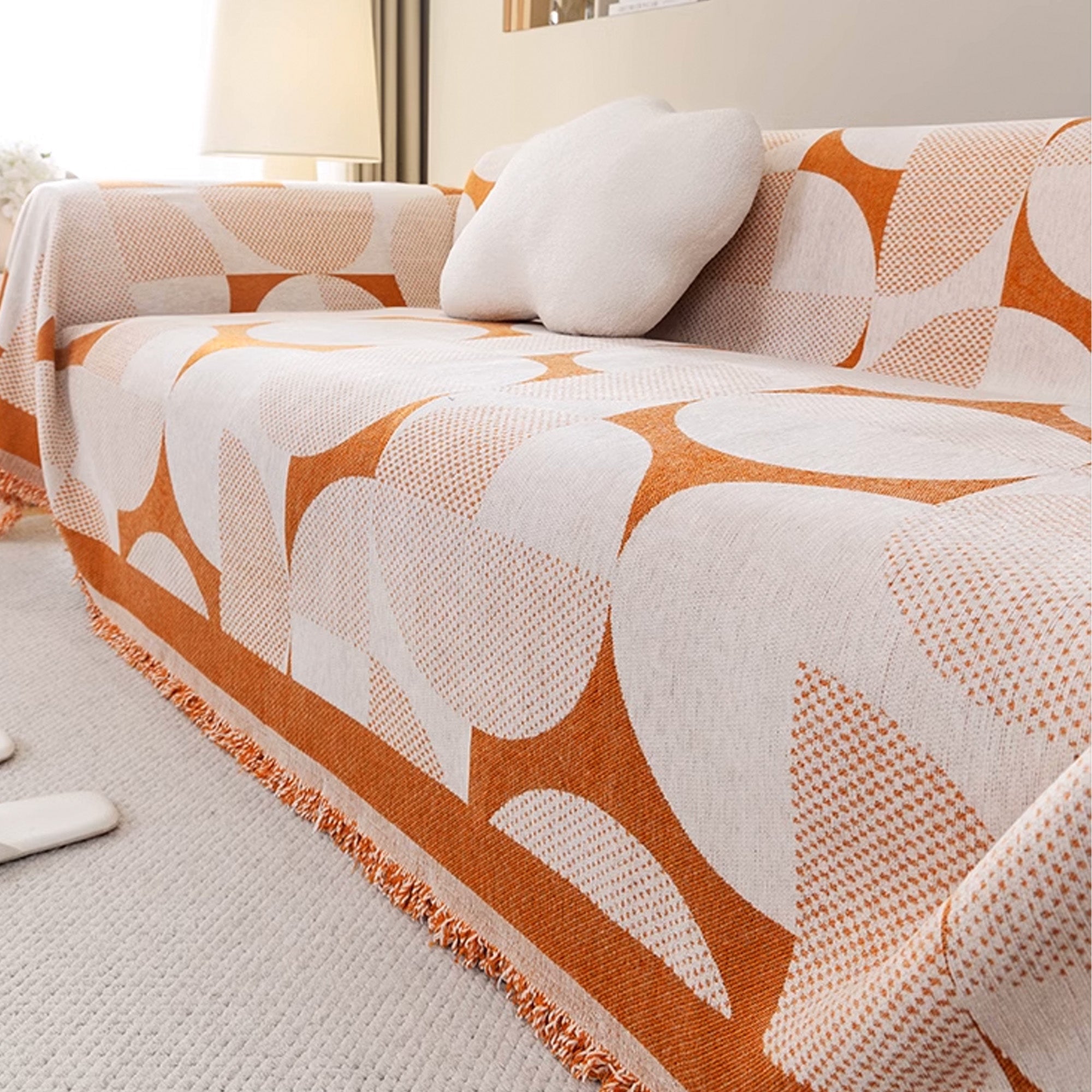 Der Sofabezug mit kreisförmigem geometrischem Muster verleiht Ihrem Wohnraum mit seinem markanten Design eine lebendige und verspielte Note. Die kreisförmigen Muster in leuchtendem Orange bringen Energie und modernes Flair in jeden Raum und machen den Bezug zu einem echten Blickfang.