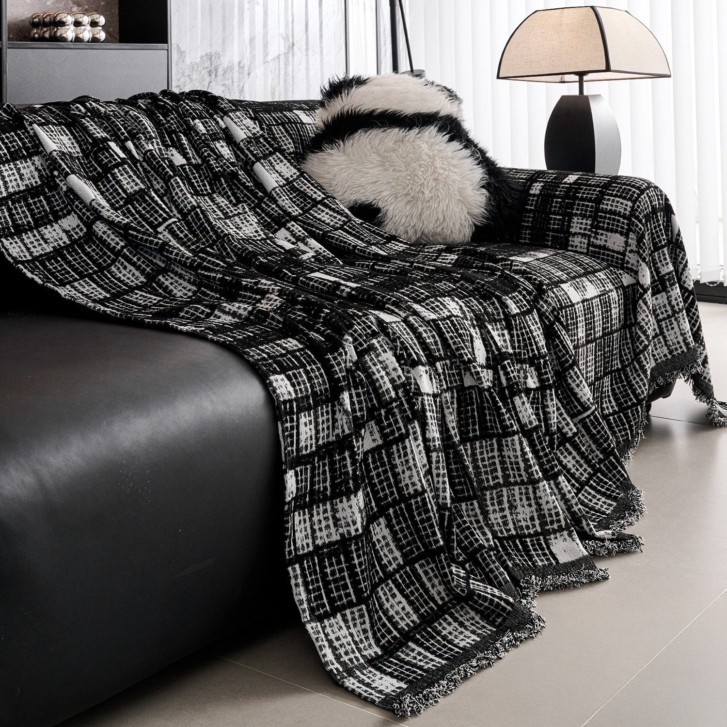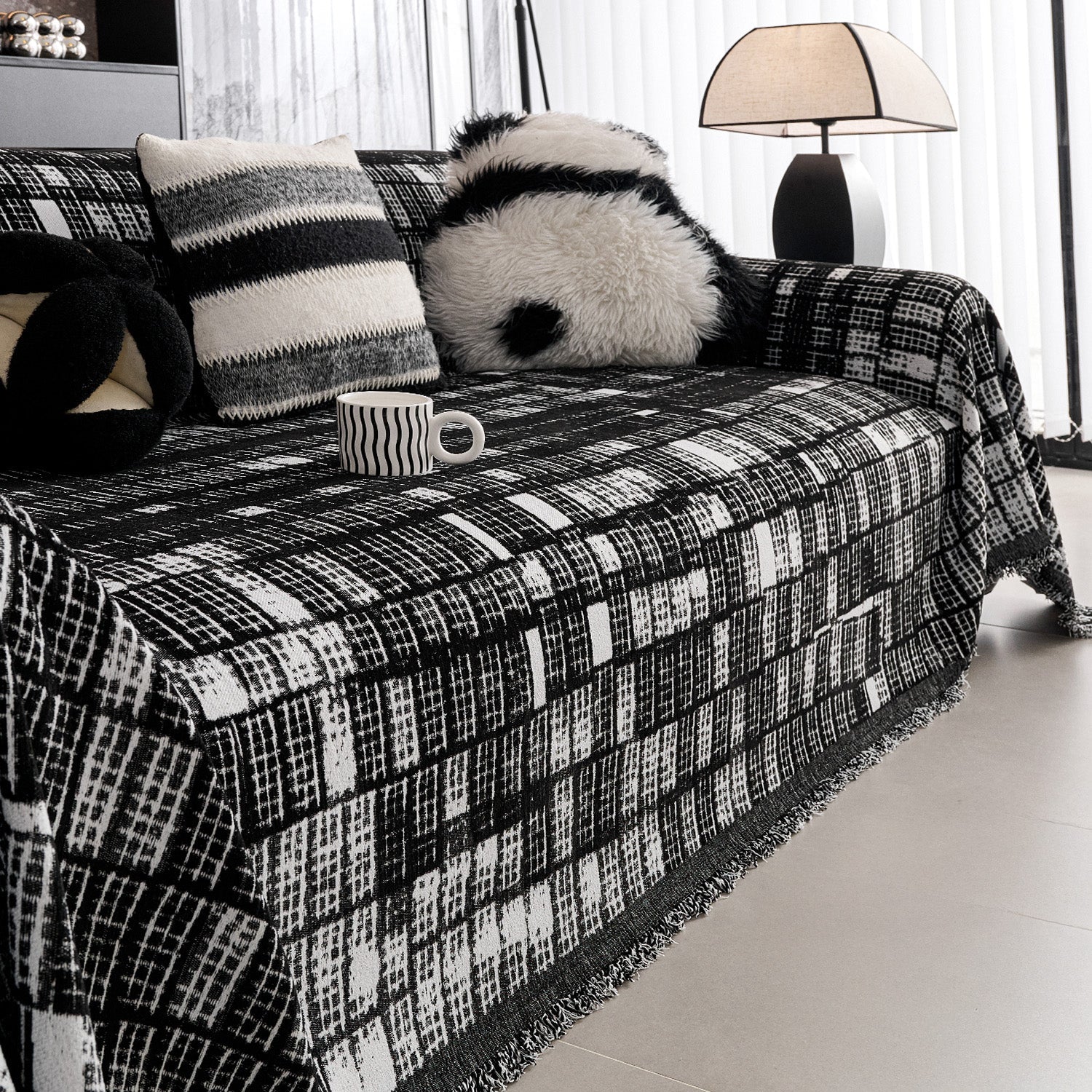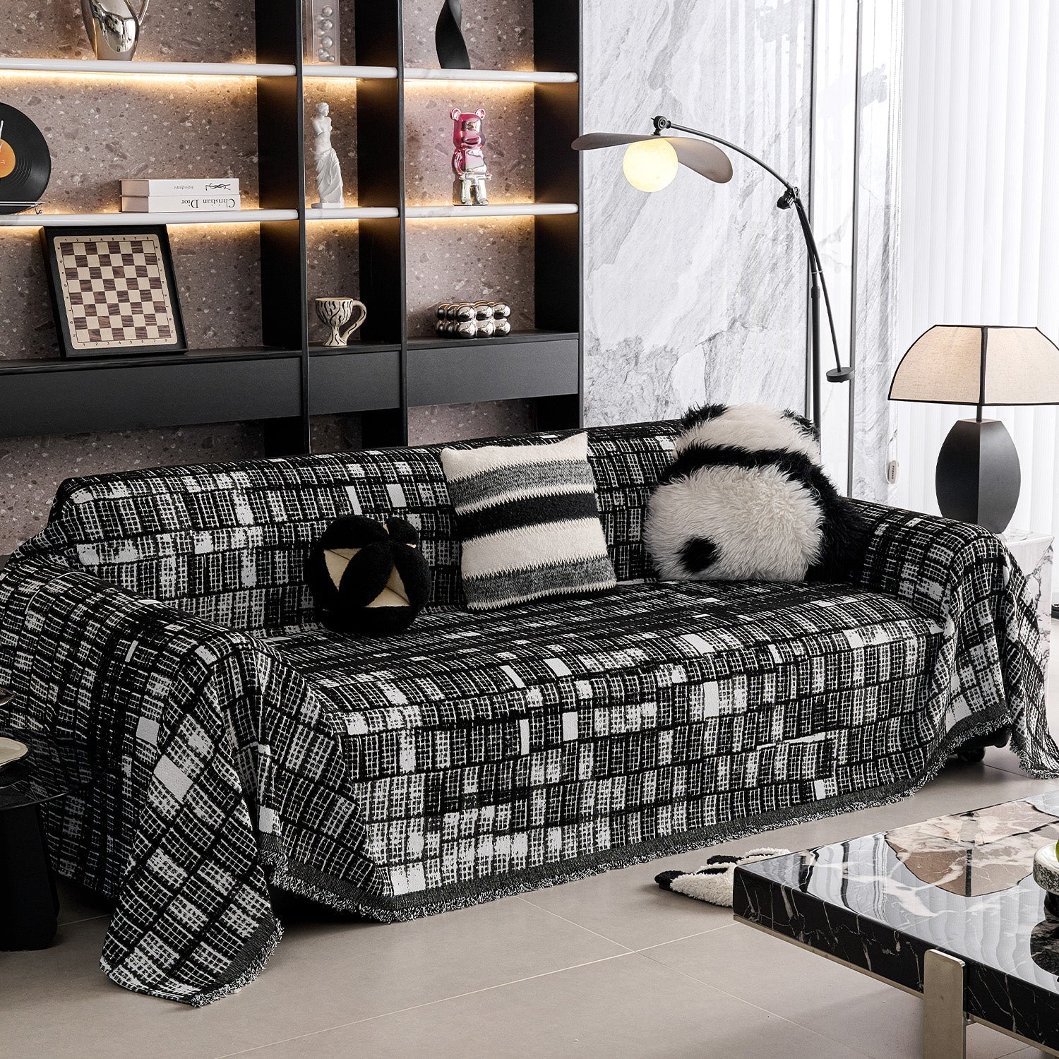 Verleihen Sie Ihrem Zuhause mit unserem kratzfesten Sofabezug „Modern Grid“ aus Chenille moderne Eleganz und dauerhaften Komfort. Das markante schwarz-weiße Karomuster verleiht jedem Wohnraum eine ausdrucksstarke Struktur und zeitgemäßen Stil.