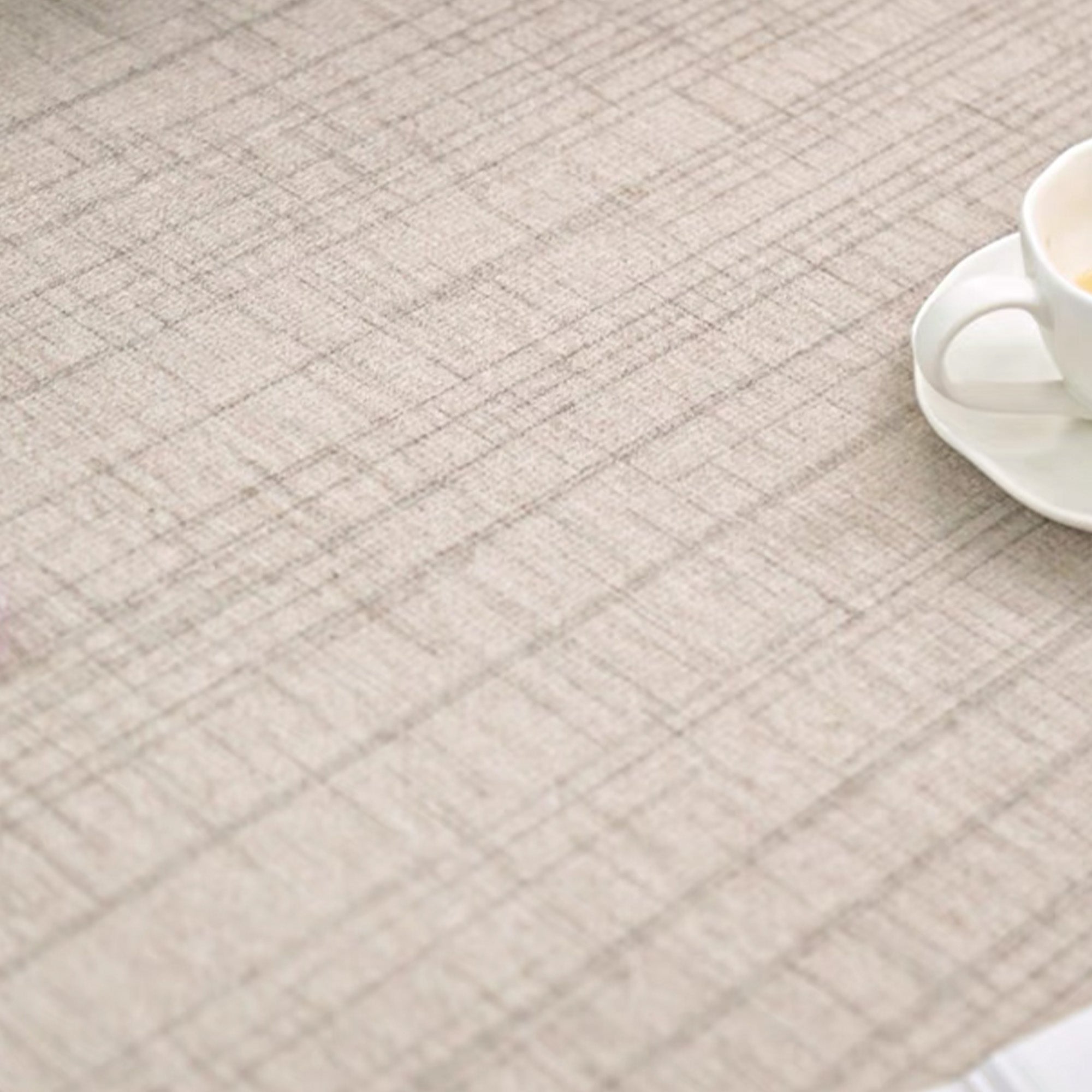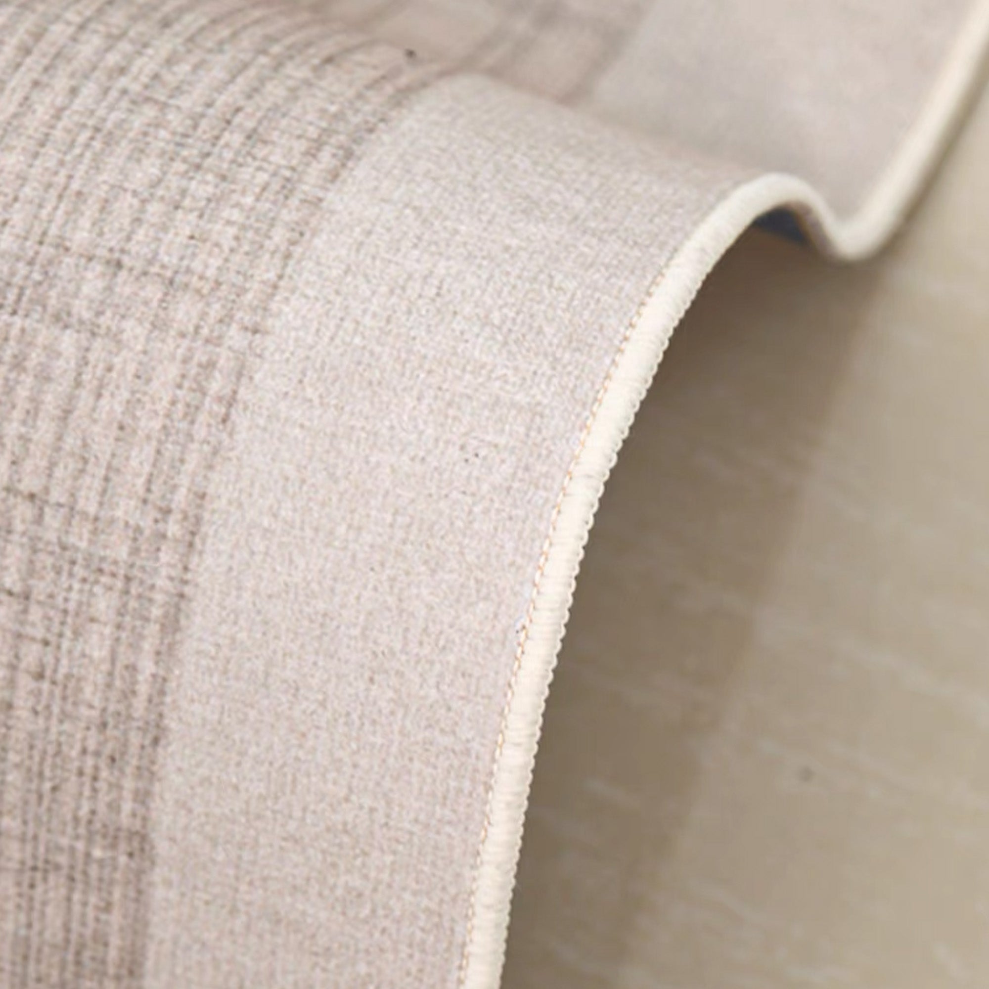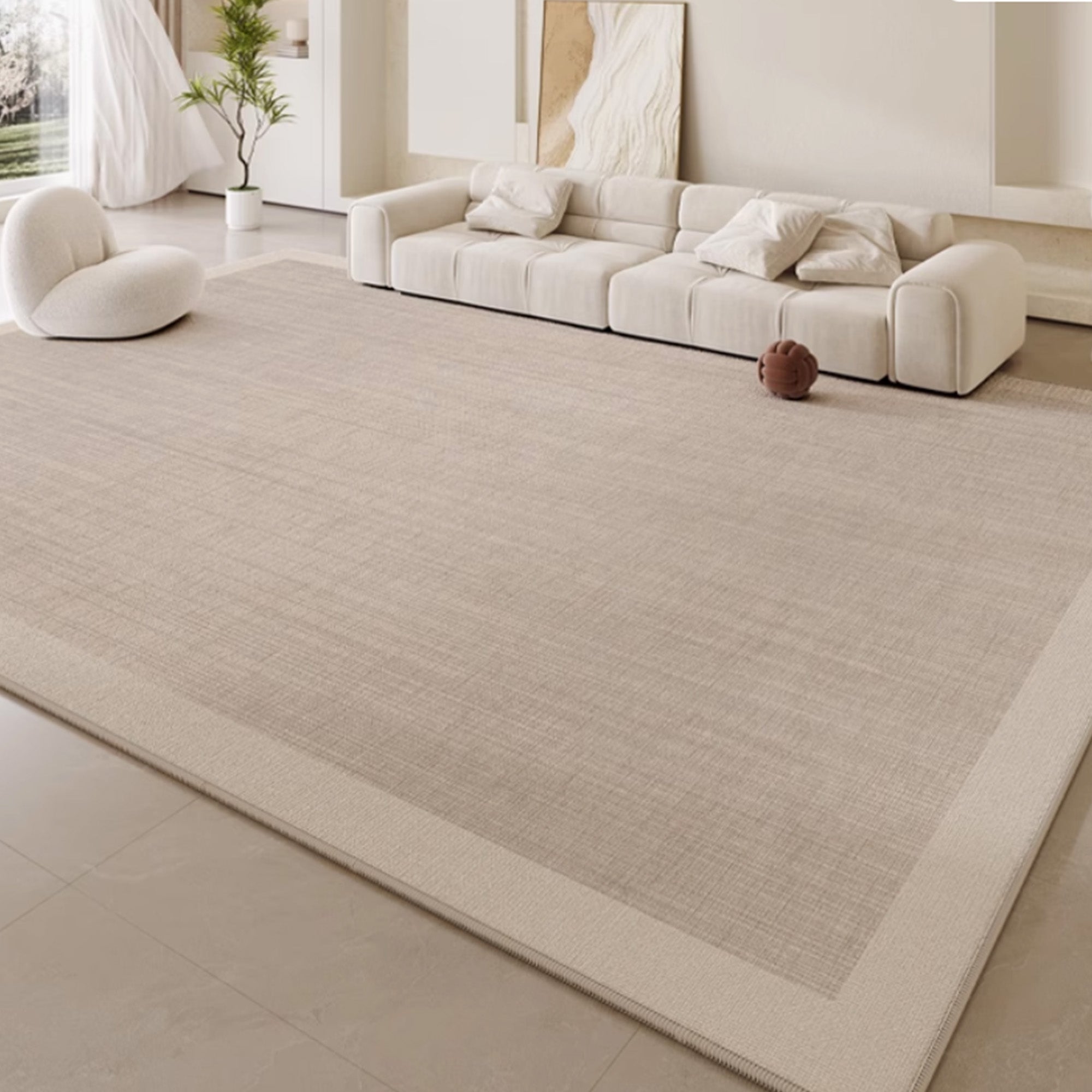 Leicht zu reinigender, beigefarbener Teppich mit harmonischer Bordüre, fleckenabweisend, haustierfreundlich, minimalistisch, für Wohnzimmer.