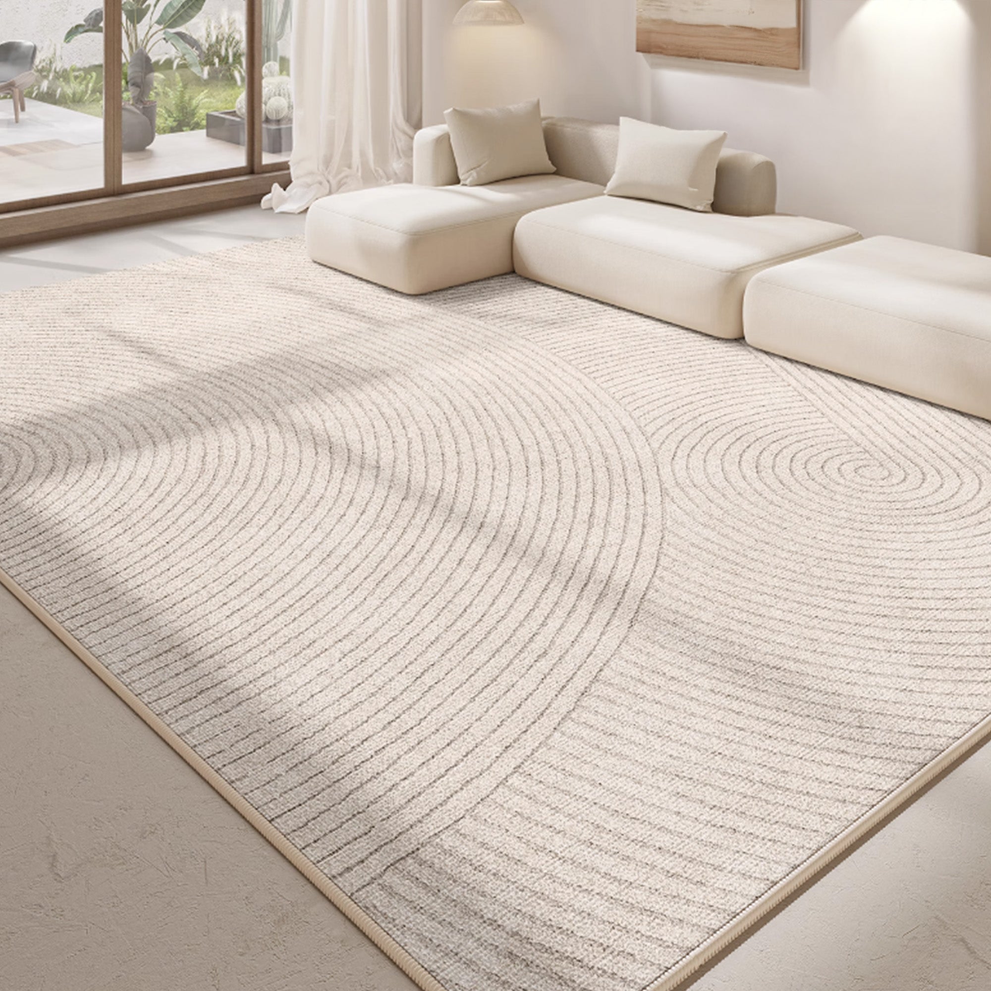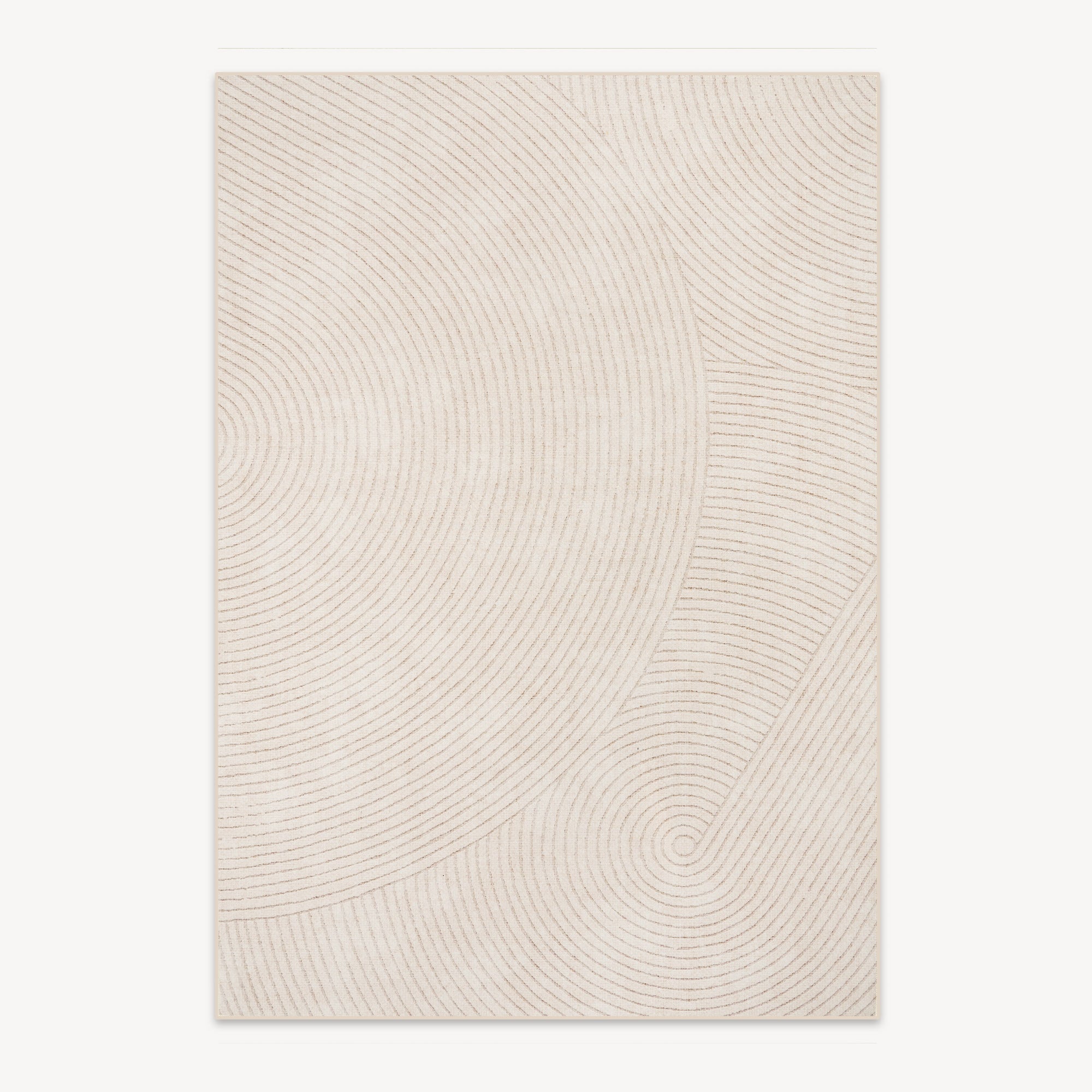 Leicht zu reinigender, beiger Zen-Spiral-Teppich, fleckenabweisend, haustierfreundlich, minimalistisch, für Wohnzimmer.