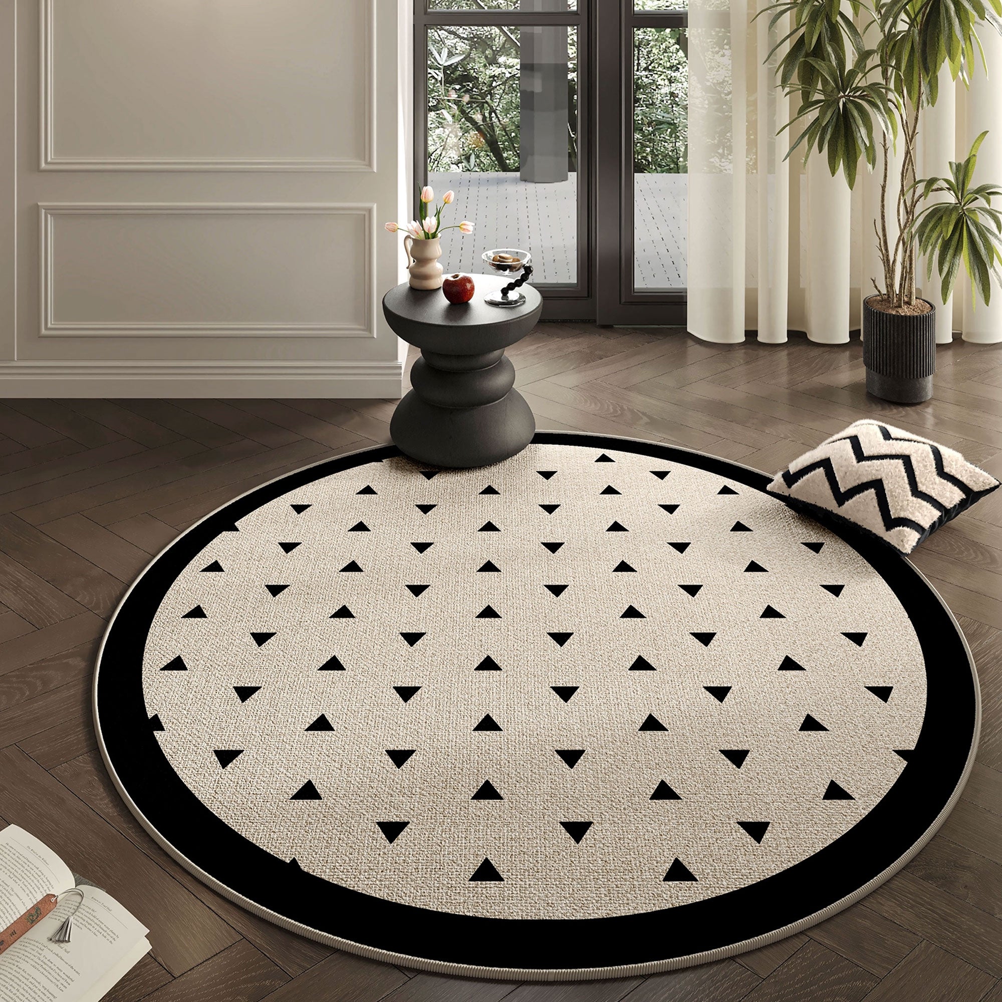 Verleihen Sie Ihrem Zimmer mit diesem geometrischen, dreieckigen, runden Teppich eine verspielte, moderne Note! Mit einem minimalistischen Muster aus kleinen schwarzen Dreiecken auf einem sanft beigen Hintergrund, eingefasst von einem markanten schwarzen Ring, vereint dieser Teppich Schlichtheit und Stil in einem einzigartigen Design.