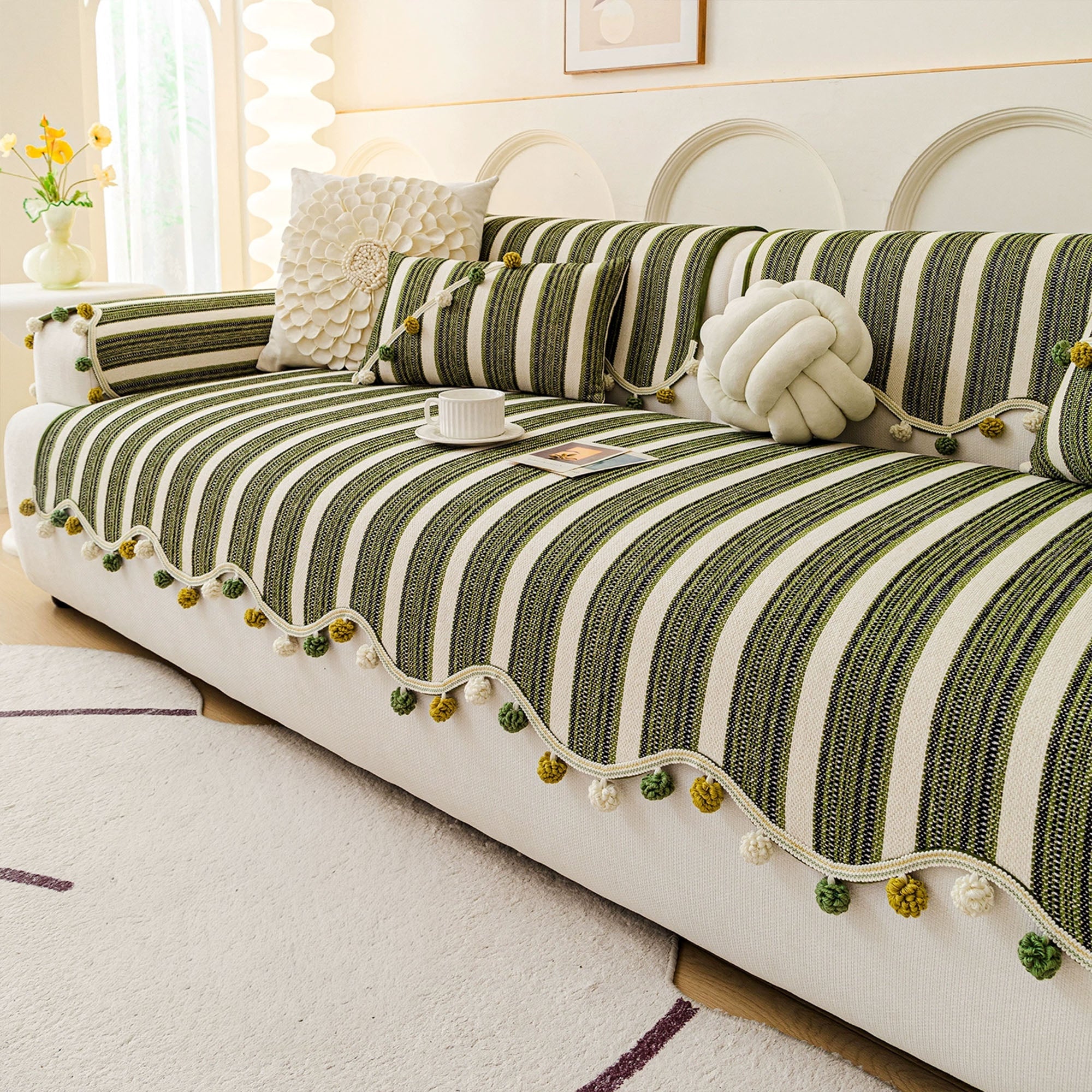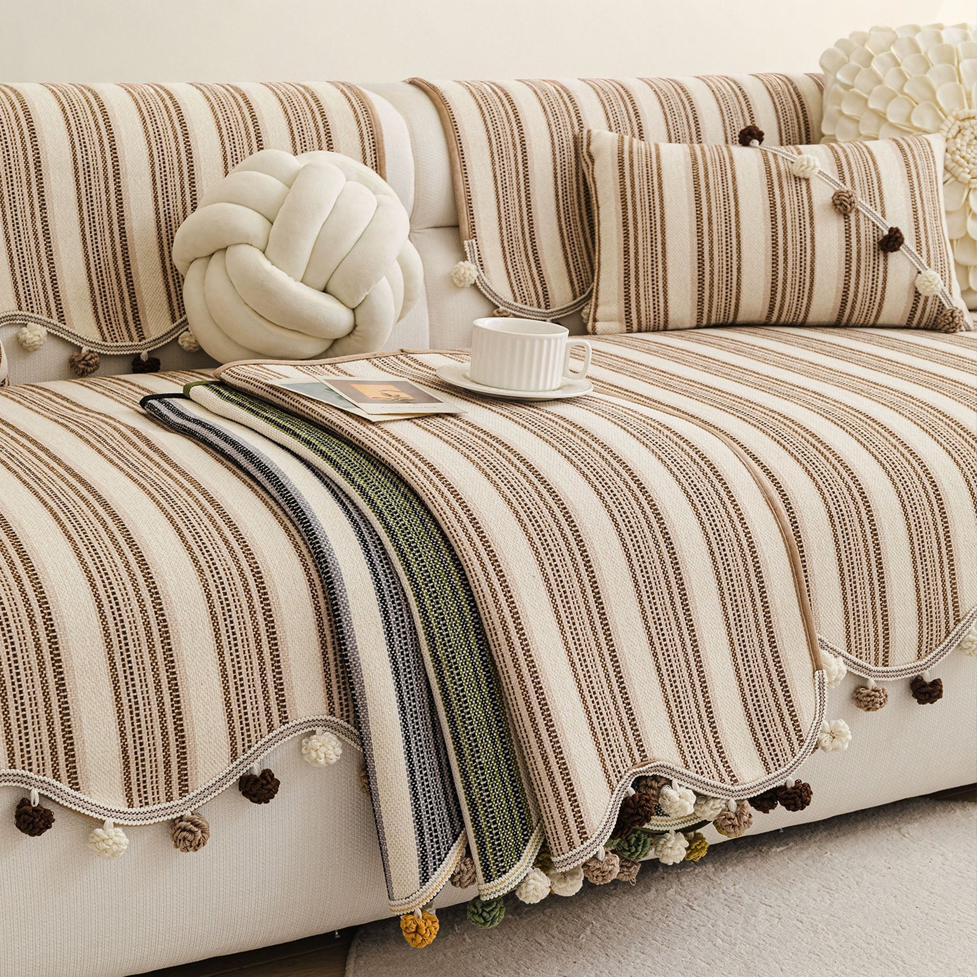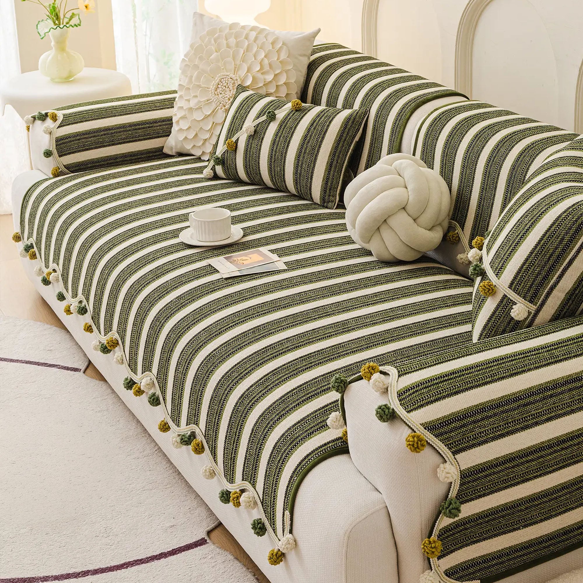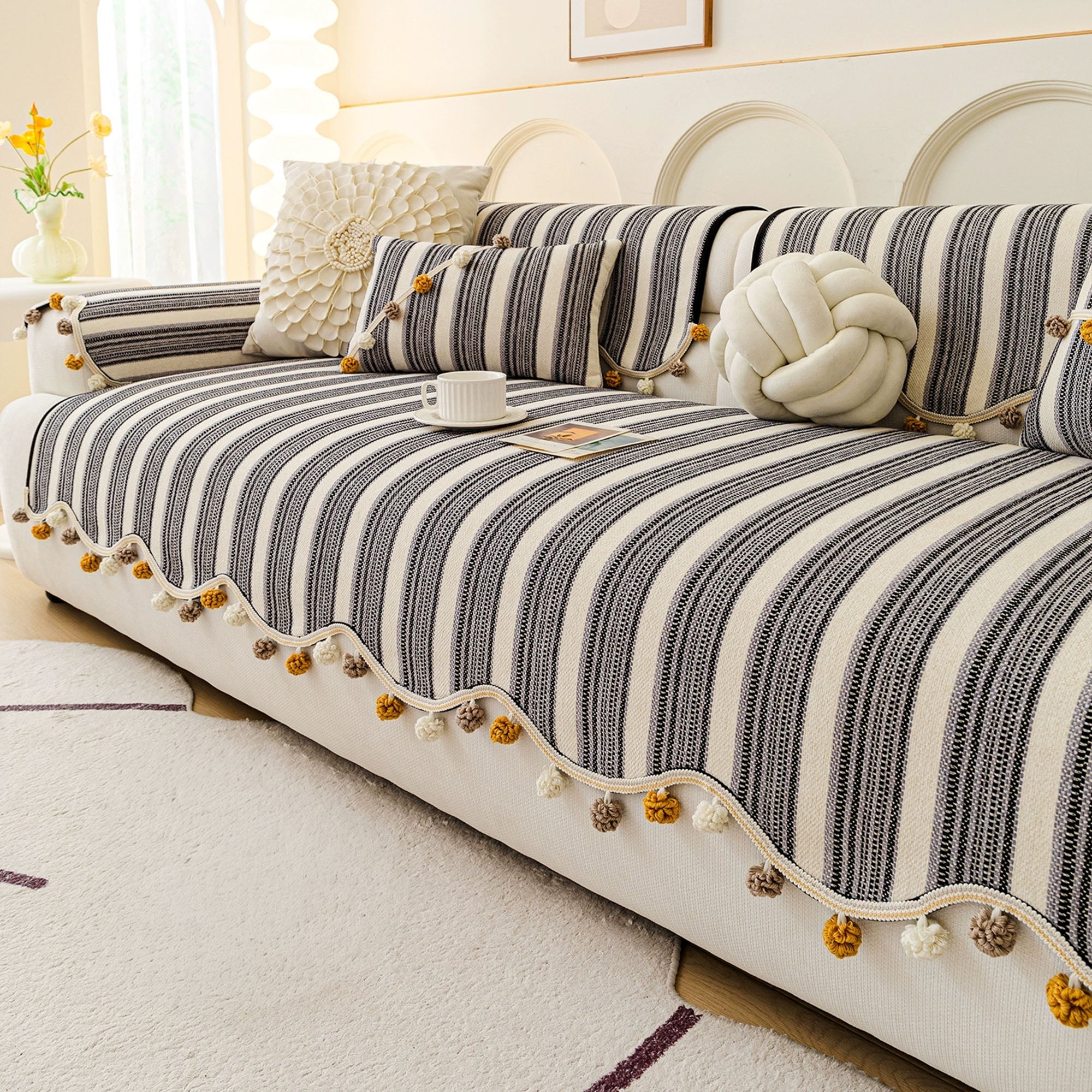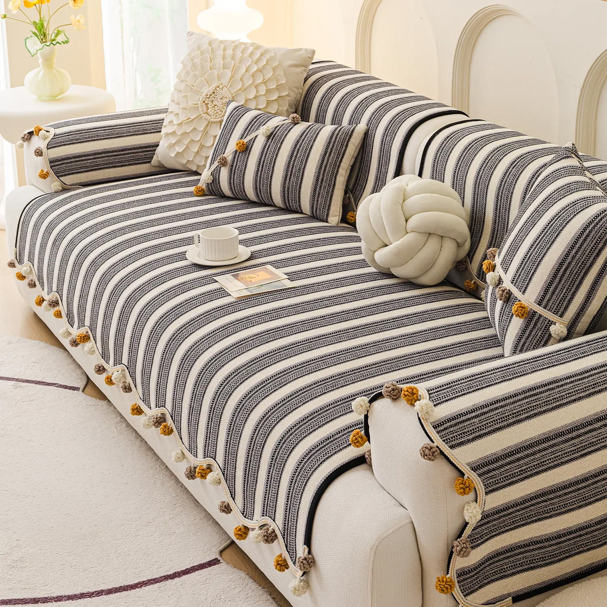 Schicker, gestreifter, rutschfester Sofabezug mit Pompons