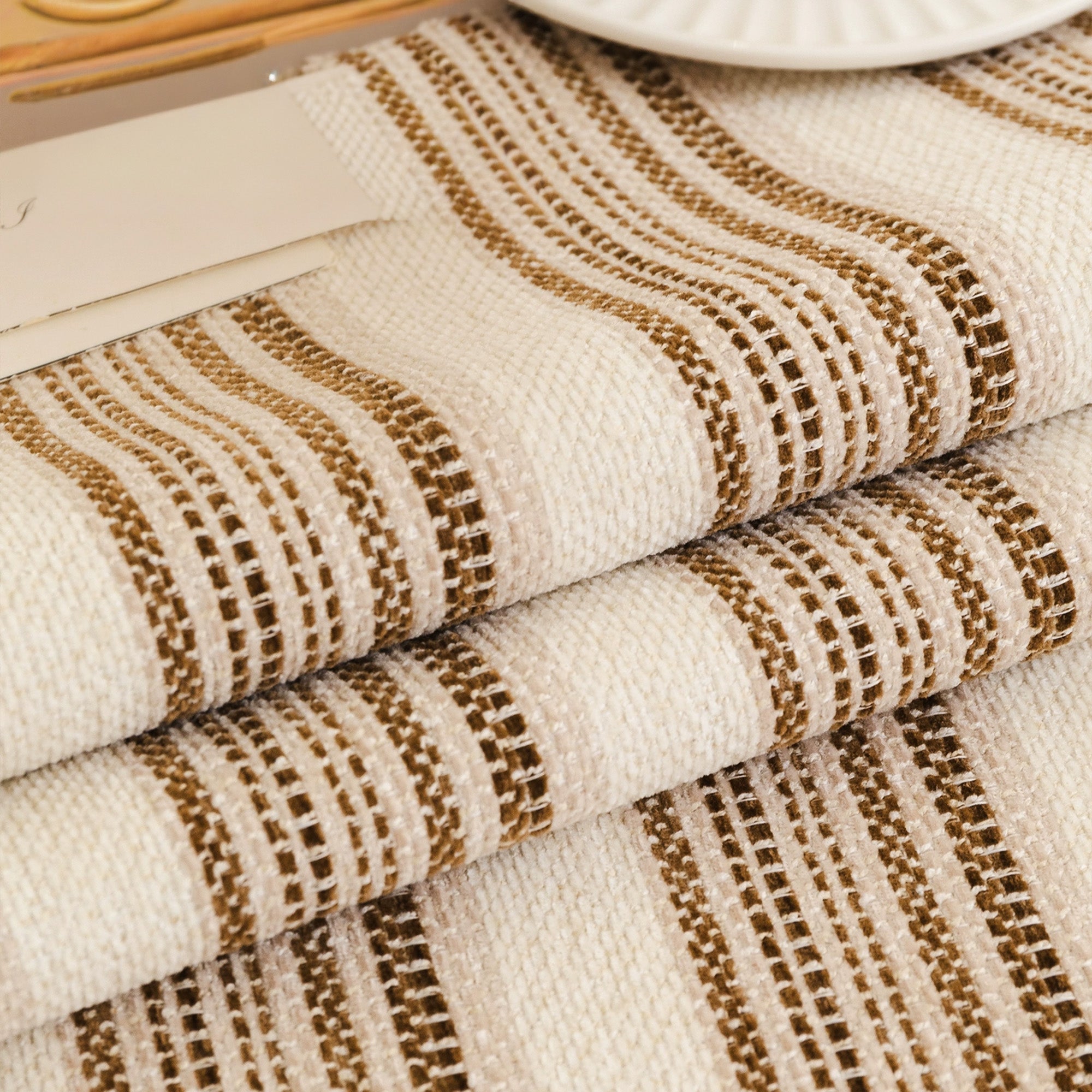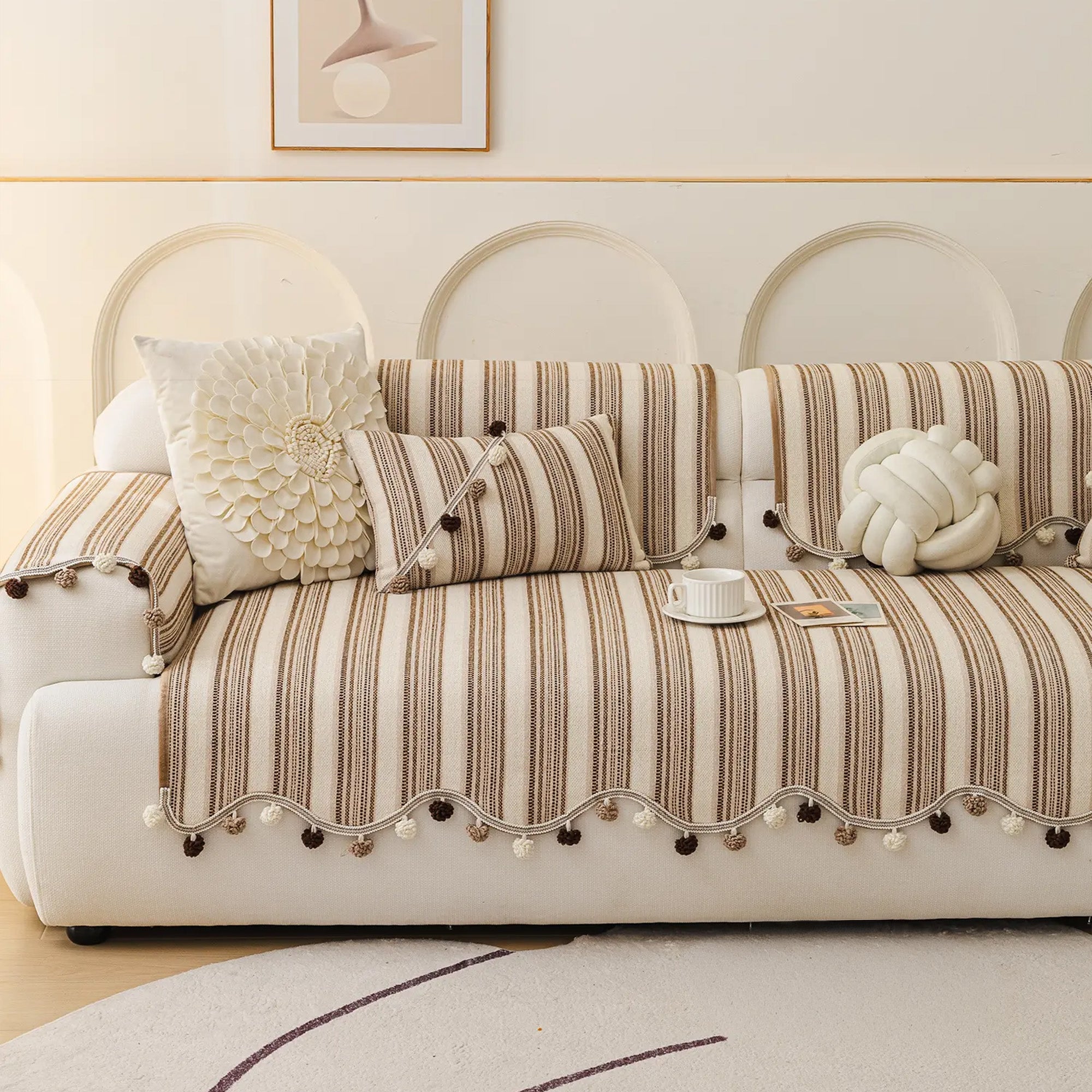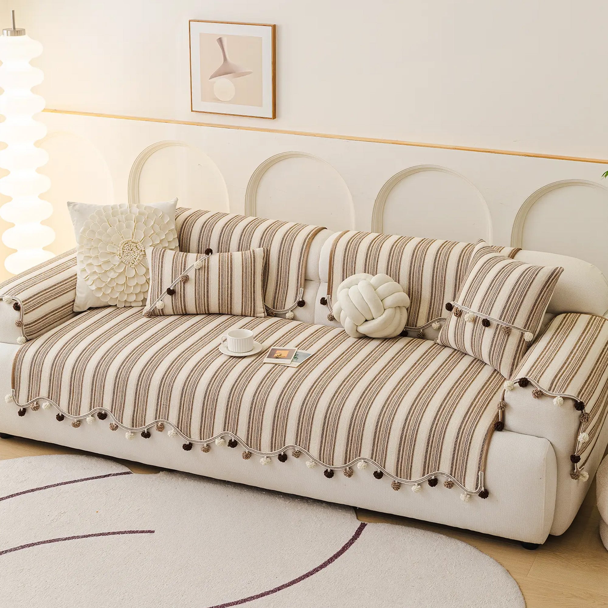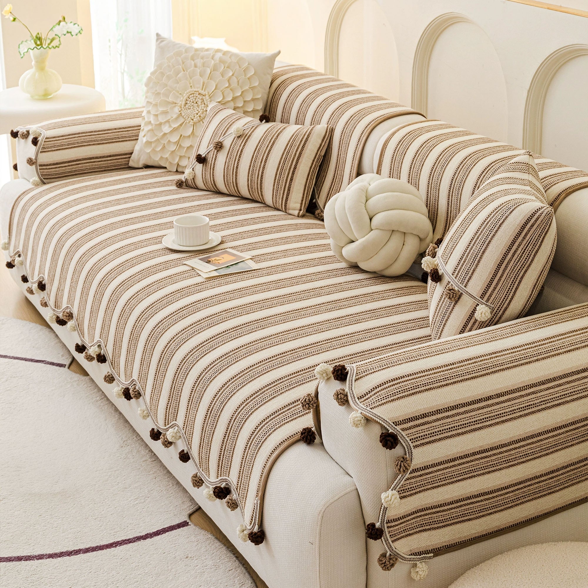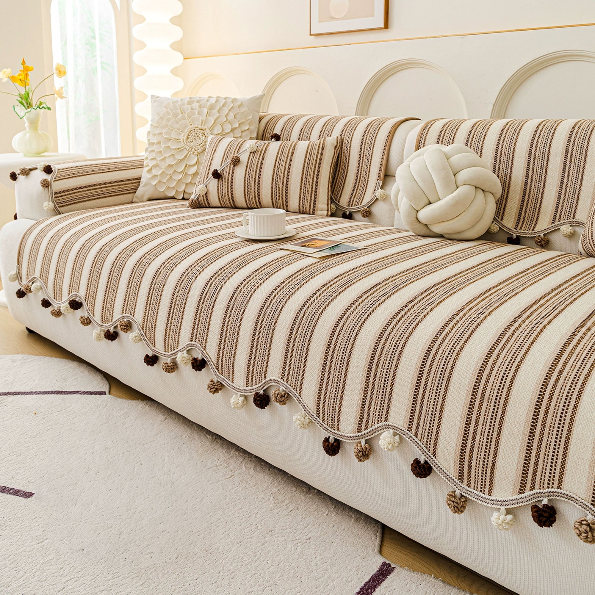 Schicker, gestreifter, rutschfester Sofabezug mit Pompons