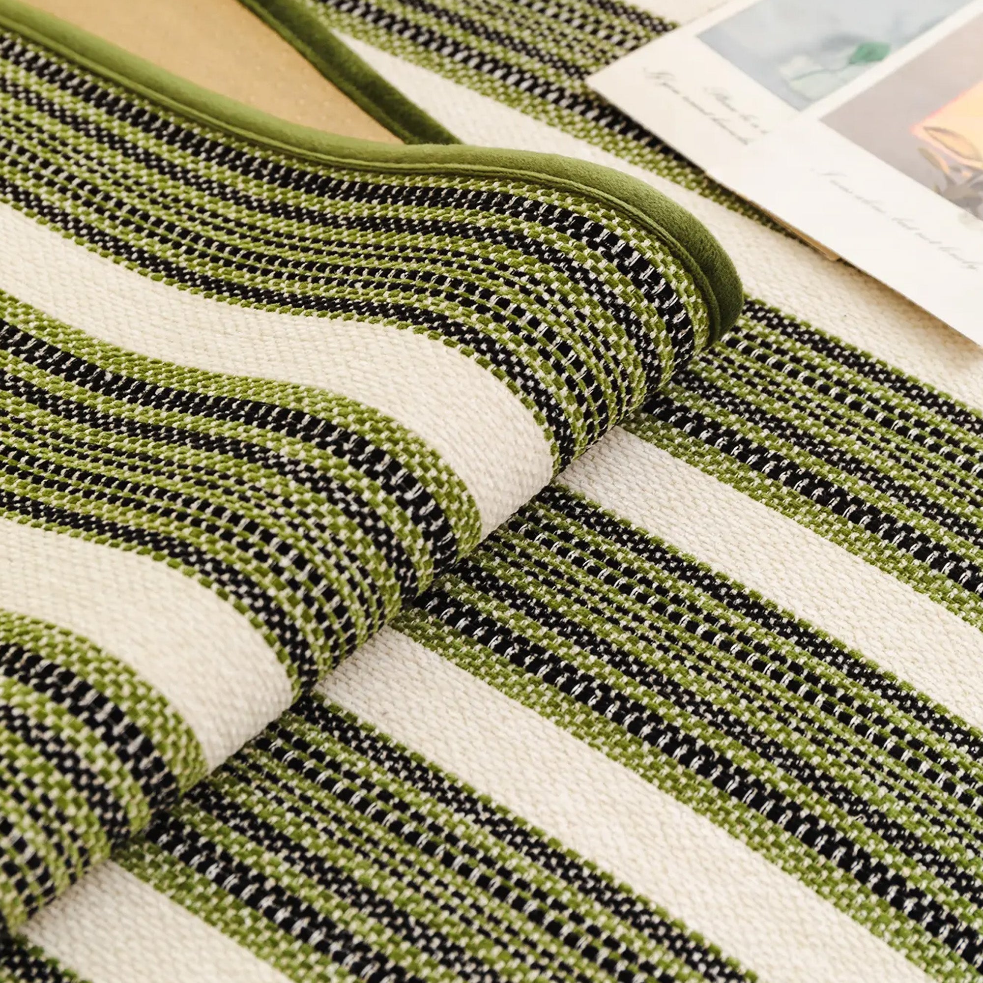Verleihen Sie Ihrem Wohnraum verspielte Eleganz und Komfort mit unserem rutschfesten Sofabezug „Chic Stripe Pompon“. Das klassische Streifenmuster und der verspielte Pomponrand machen diesen Bezug zu einem charmanten und stilvollen Blickfang in jedem Raum.
