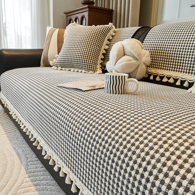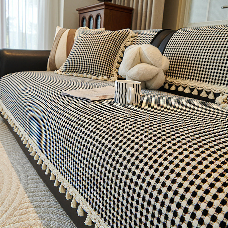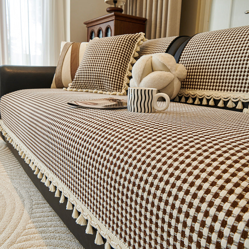 Gemütlicher Sofabezug aus Chenille mit Vichy-Karo, Quasten und rutschfester Oberfläche