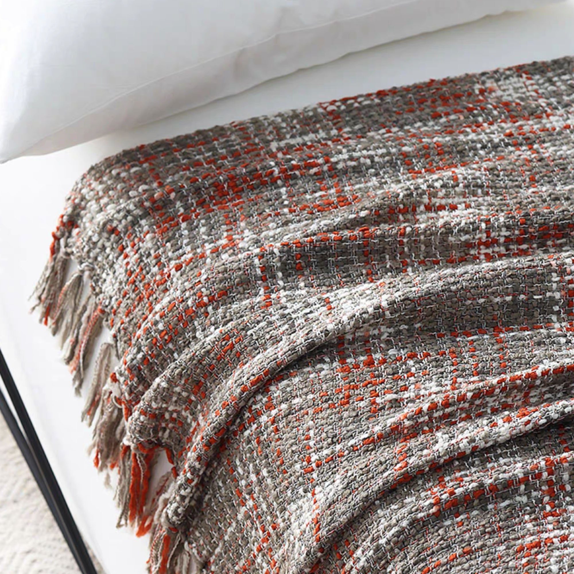 Verleihen Sie Ihrem Wohnraum mit dieser rustikalen Tweed-Wohndecke einen Hauch von Charme. Gewebt in einer harmonischen Mischung aus Erdtönen mit warmen Orangetönen, strahlt diese Decke behagliche Eleganz aus. Ihre strukturierte Webart und die Fransen verleihen jedem Interieur einen zeitlosen Charme und machen sie perfekt zum Überziehen von Betten oder Sofas.