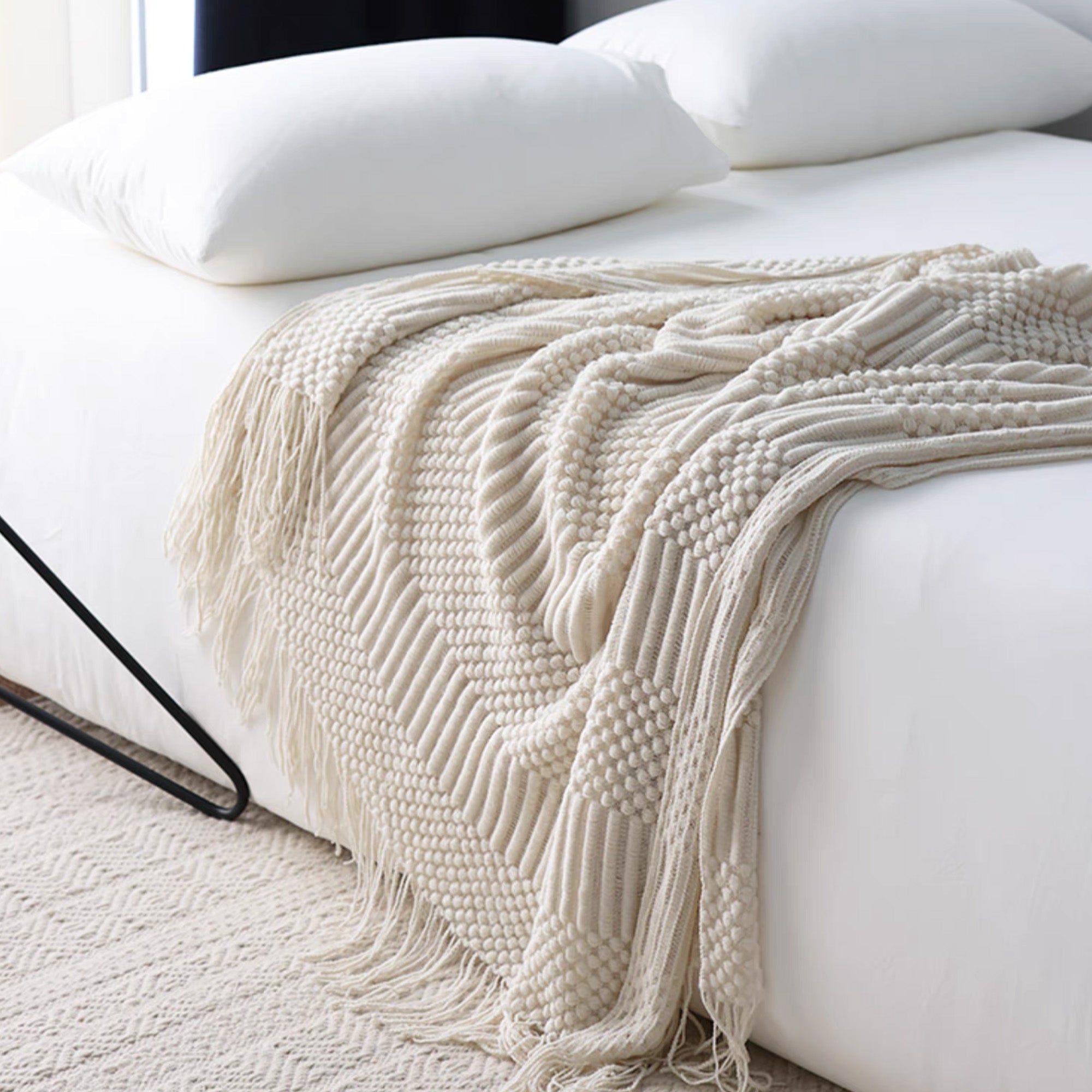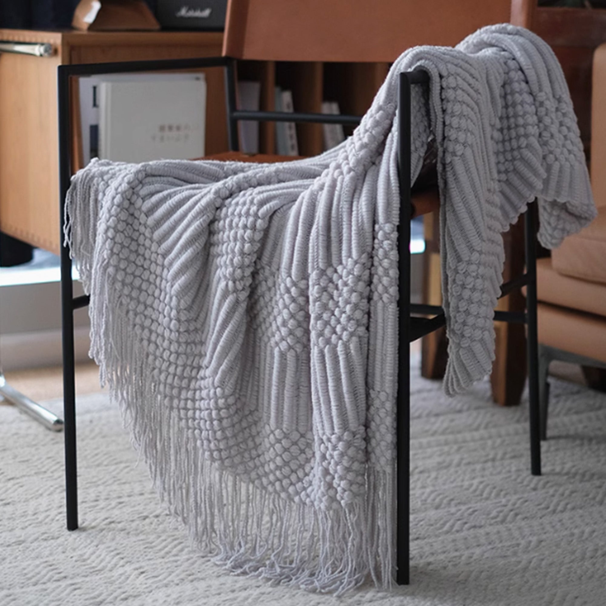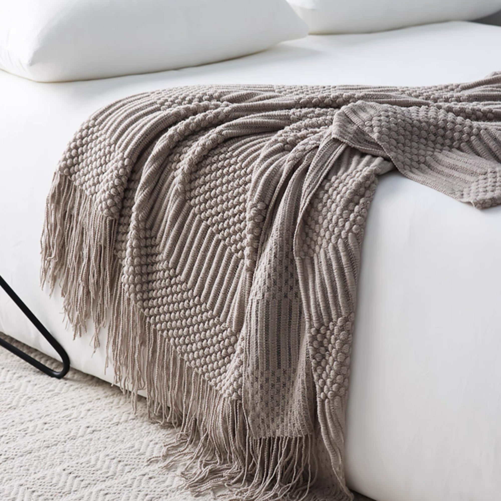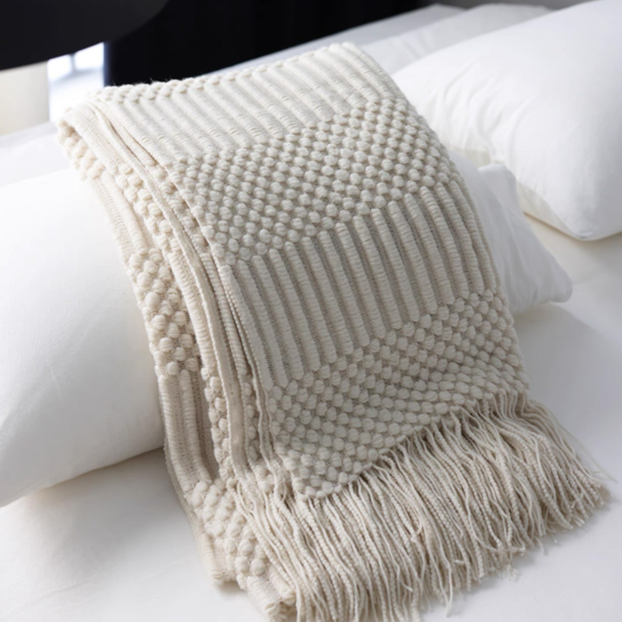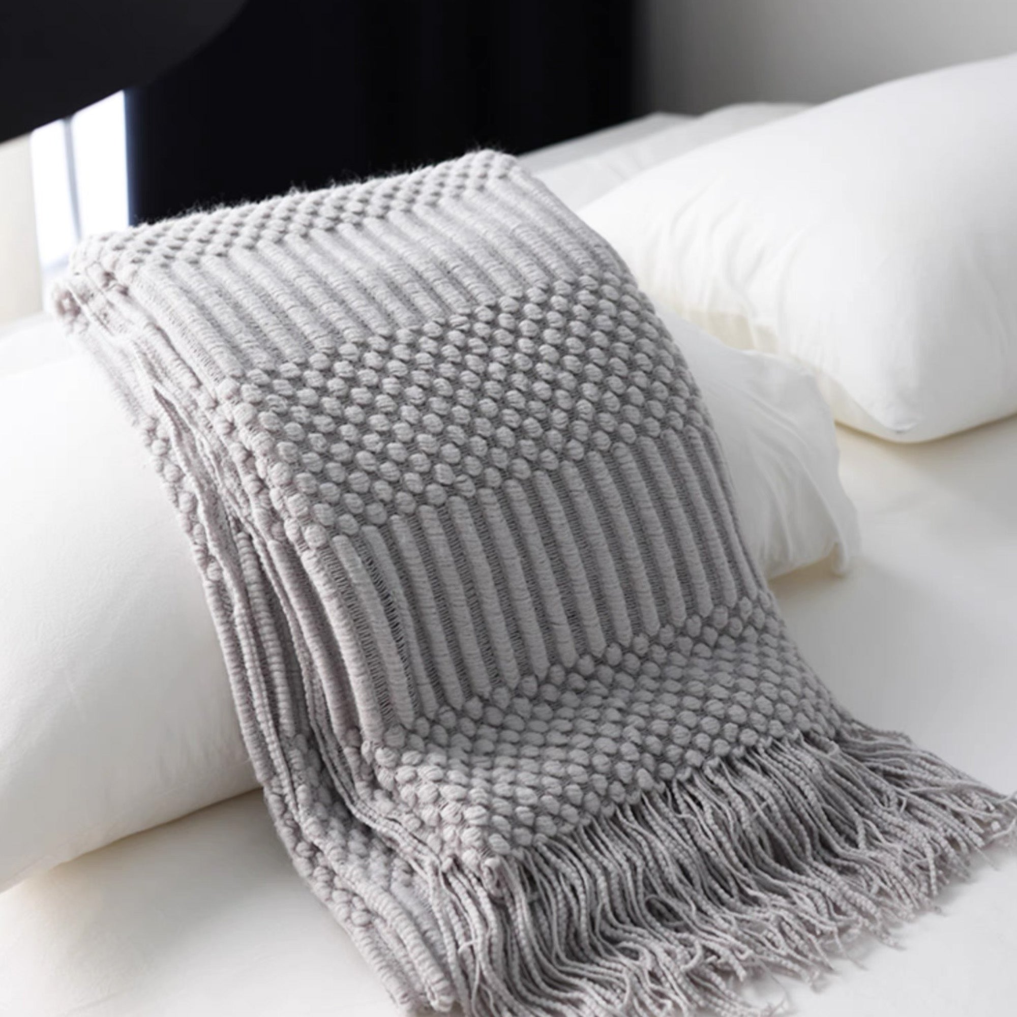 Verleihen Sie Ihrem Zuhause mit unserer strukturierten Fransen-Wohndecke einen Hauch von Bohème-Charme. Diese kuschelige Decke mit ihrem aufwendigen geometrischen Strickmuster und der angenehmen Haptik ist perfekt zum Einkuscheln oder als stilvolles Accessoire für Ihren Lieblingssessel. Die zarten Fransen unterstreichen ihre lässige Eleganz und machen sie zur idealen Wahl für eine warme und einladende Atmosphäre in jedem Raum.