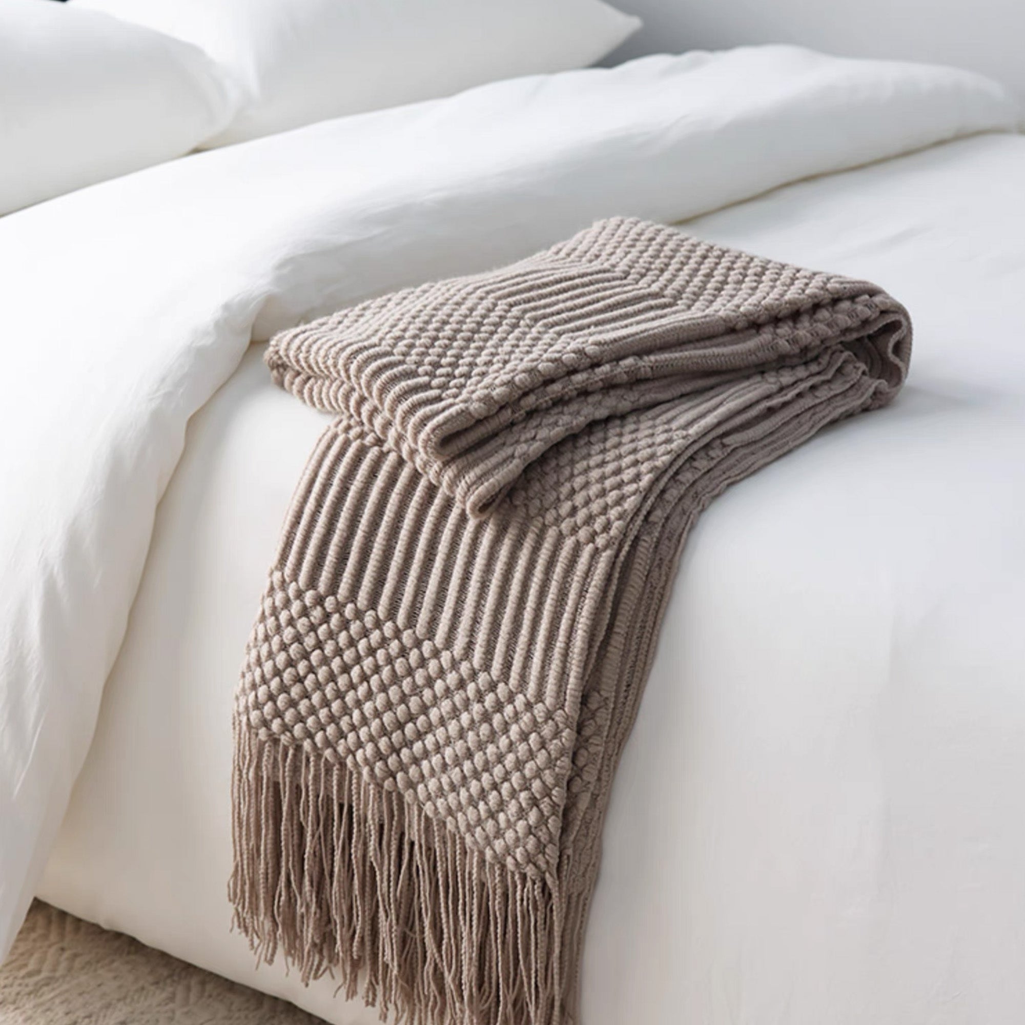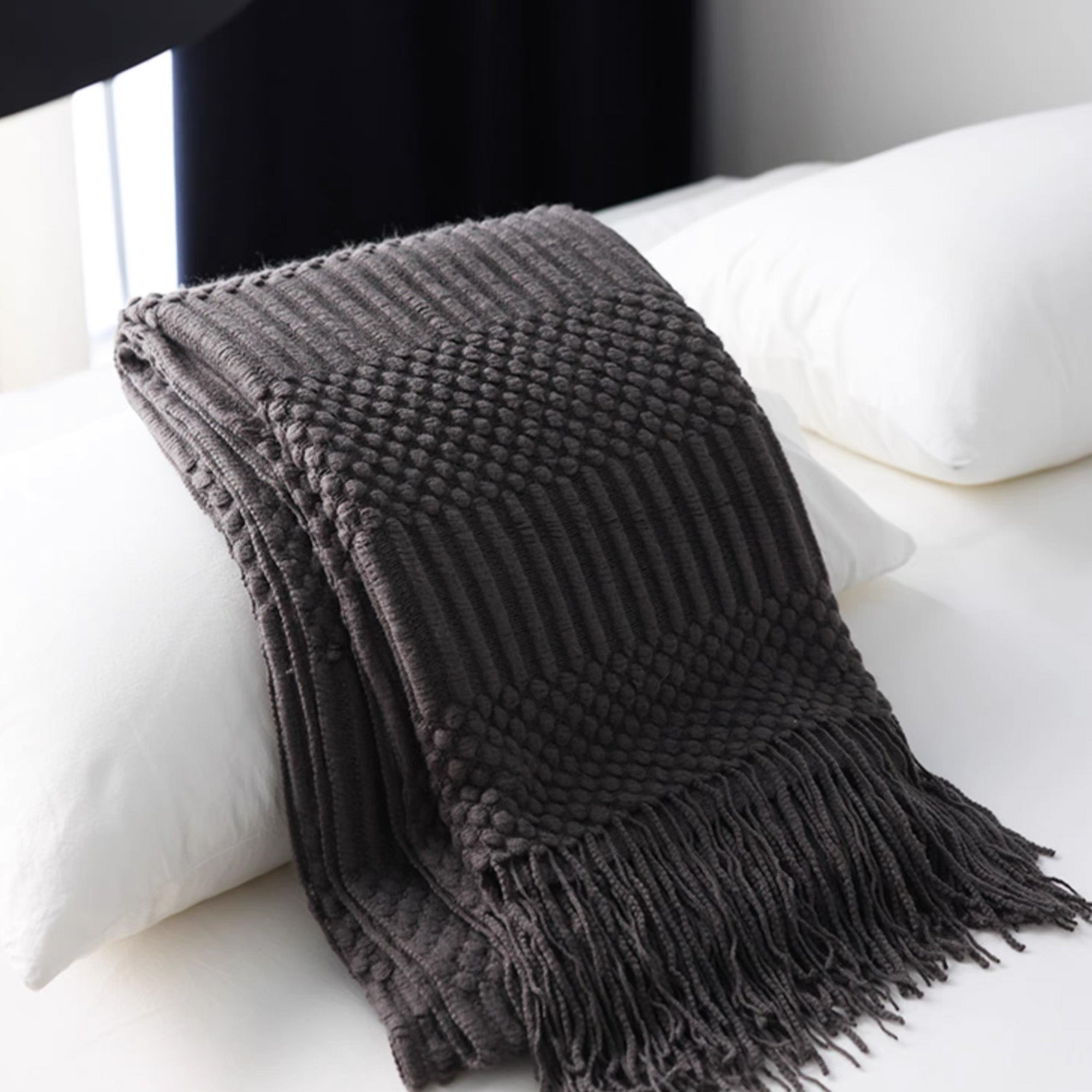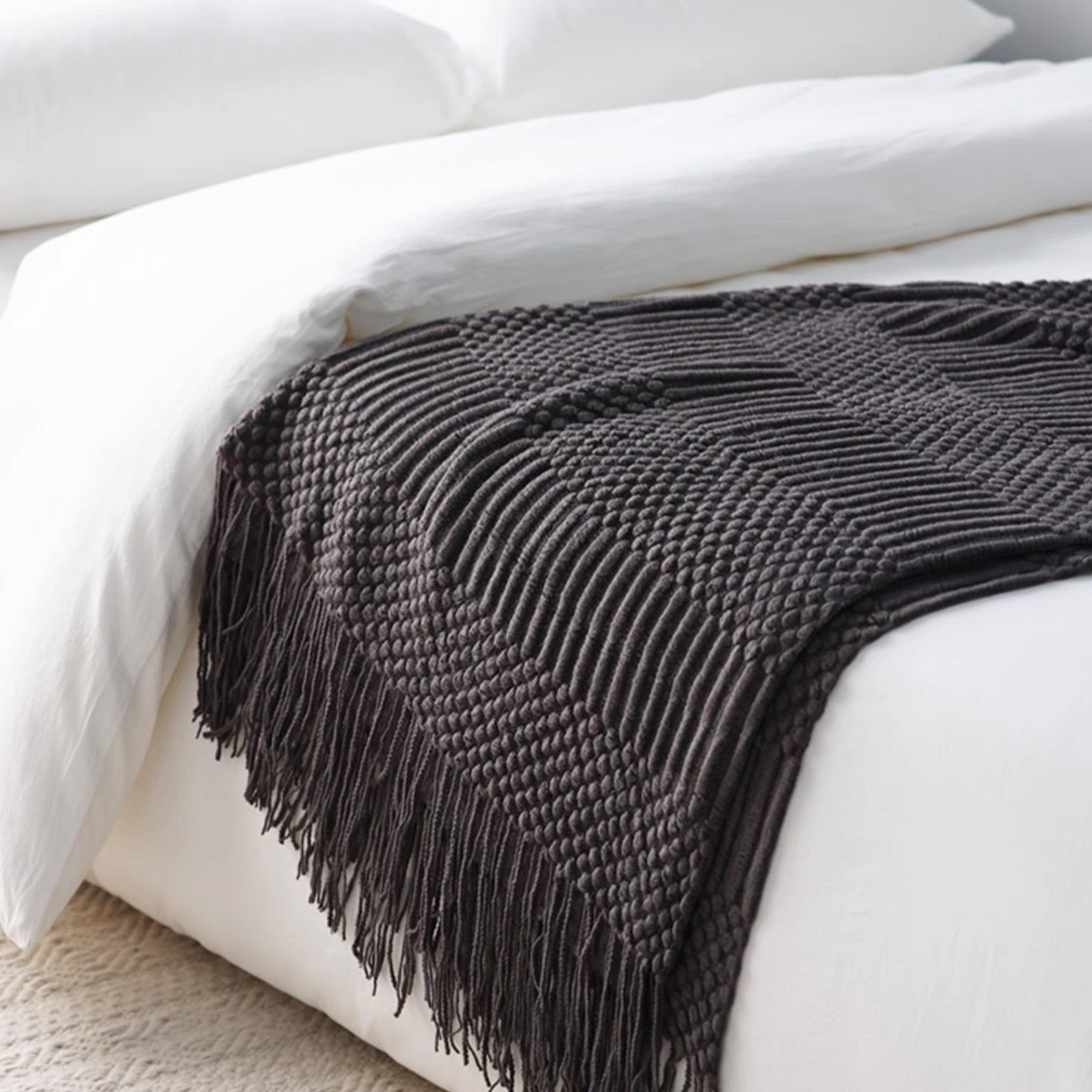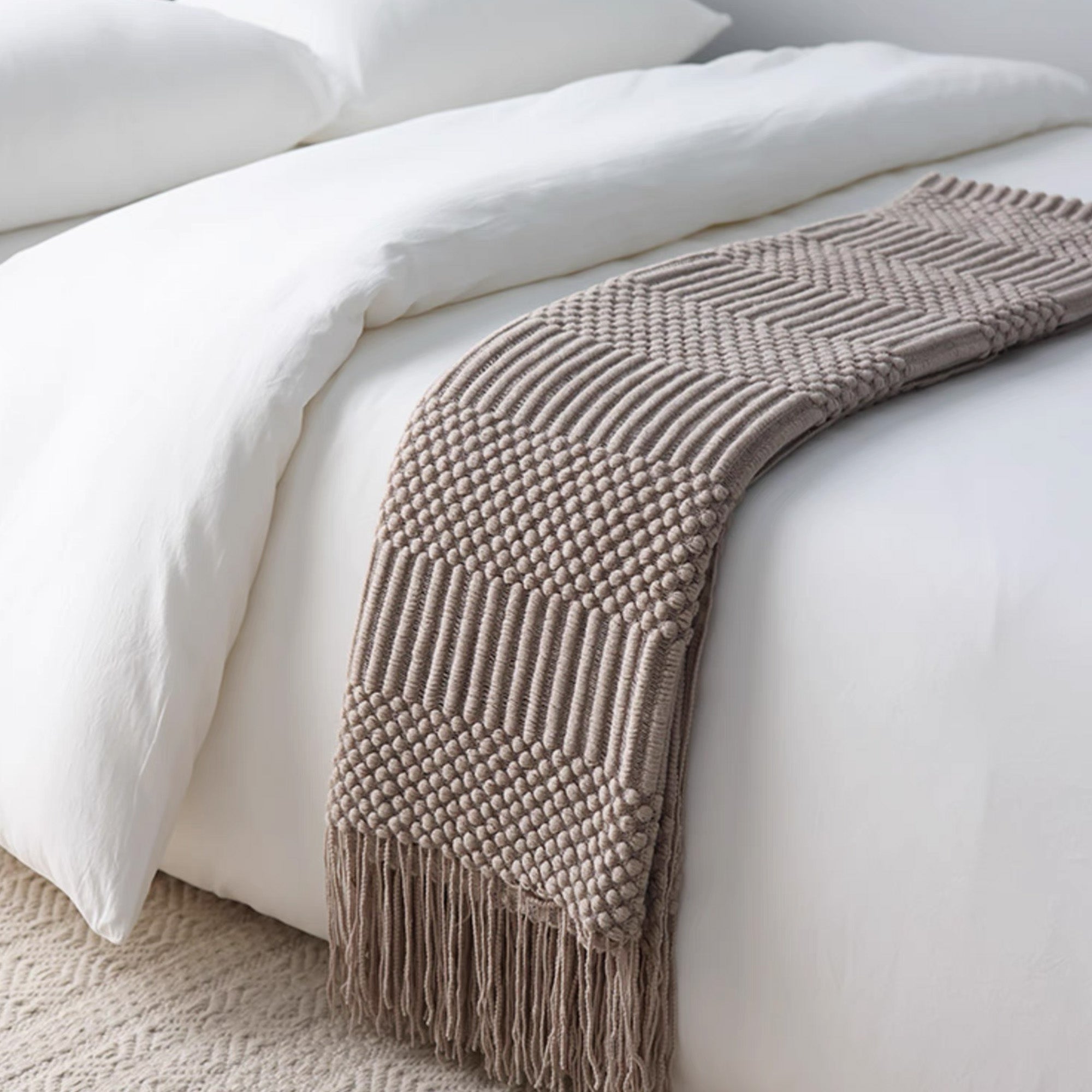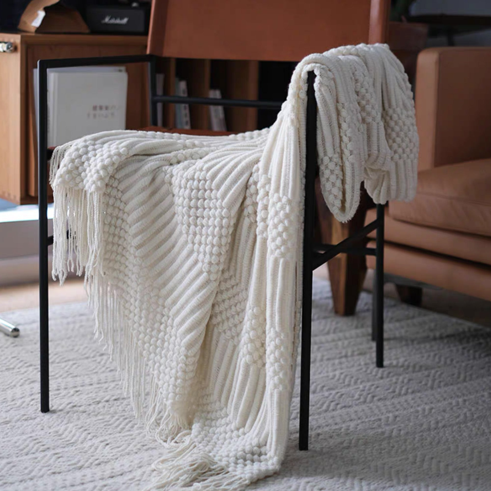 Verleihen Sie Ihrem Zuhause mit unserer strukturierten Fransen-Wohndecke einen Hauch von Bohème-Charme. Diese kuschelige Decke mit ihrem aufwendigen geometrischen Strickmuster und der angenehmen Haptik ist perfekt zum Einkuscheln oder als stilvolles Accessoire für Ihren Lieblingssessel. Die zarten Fransen unterstreichen ihre lässige Eleganz und machen sie zur idealen Wahl für eine warme und einladende Atmosphäre in jedem Raum.