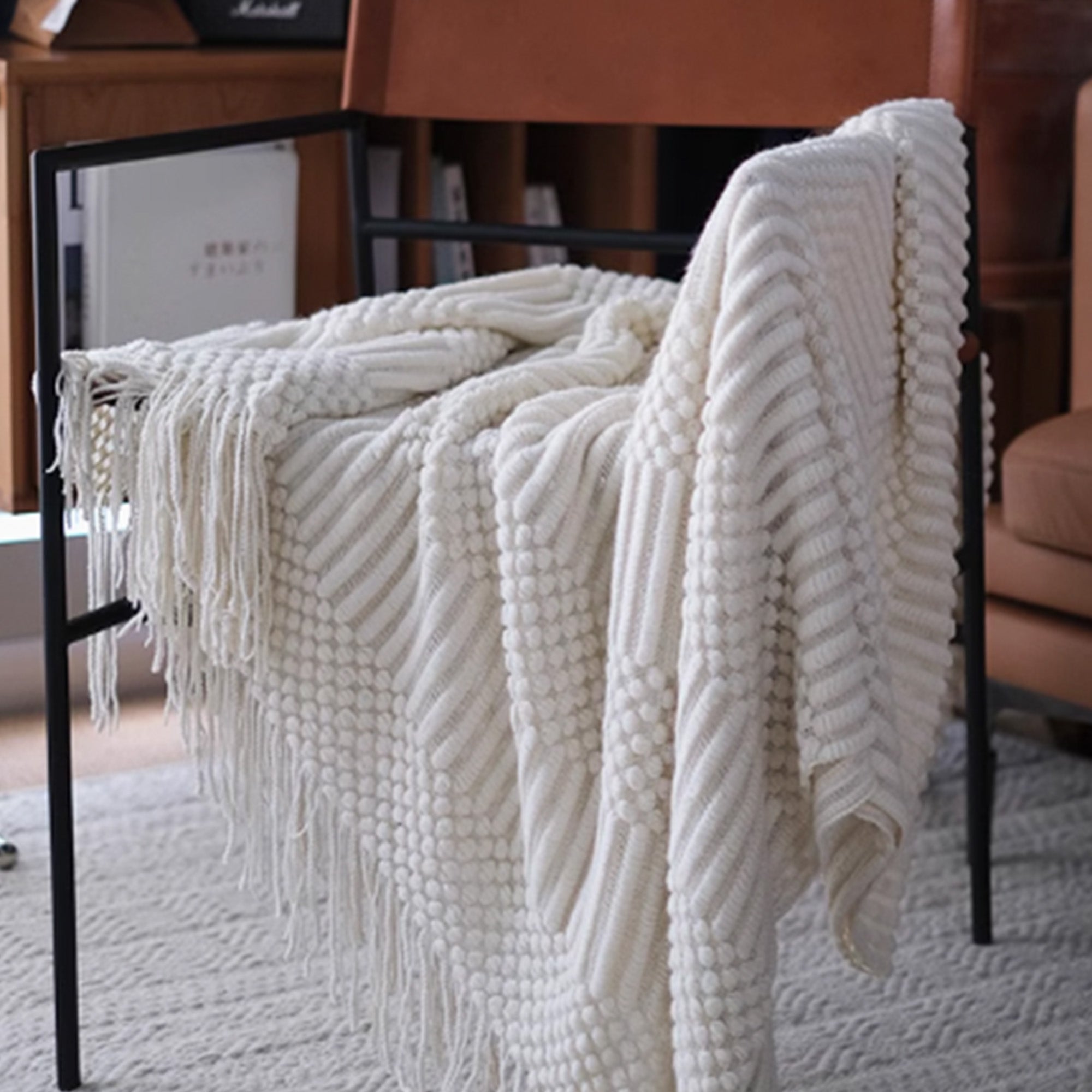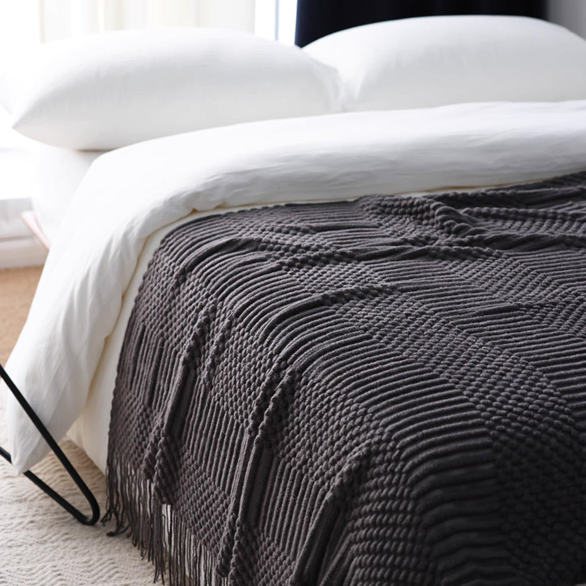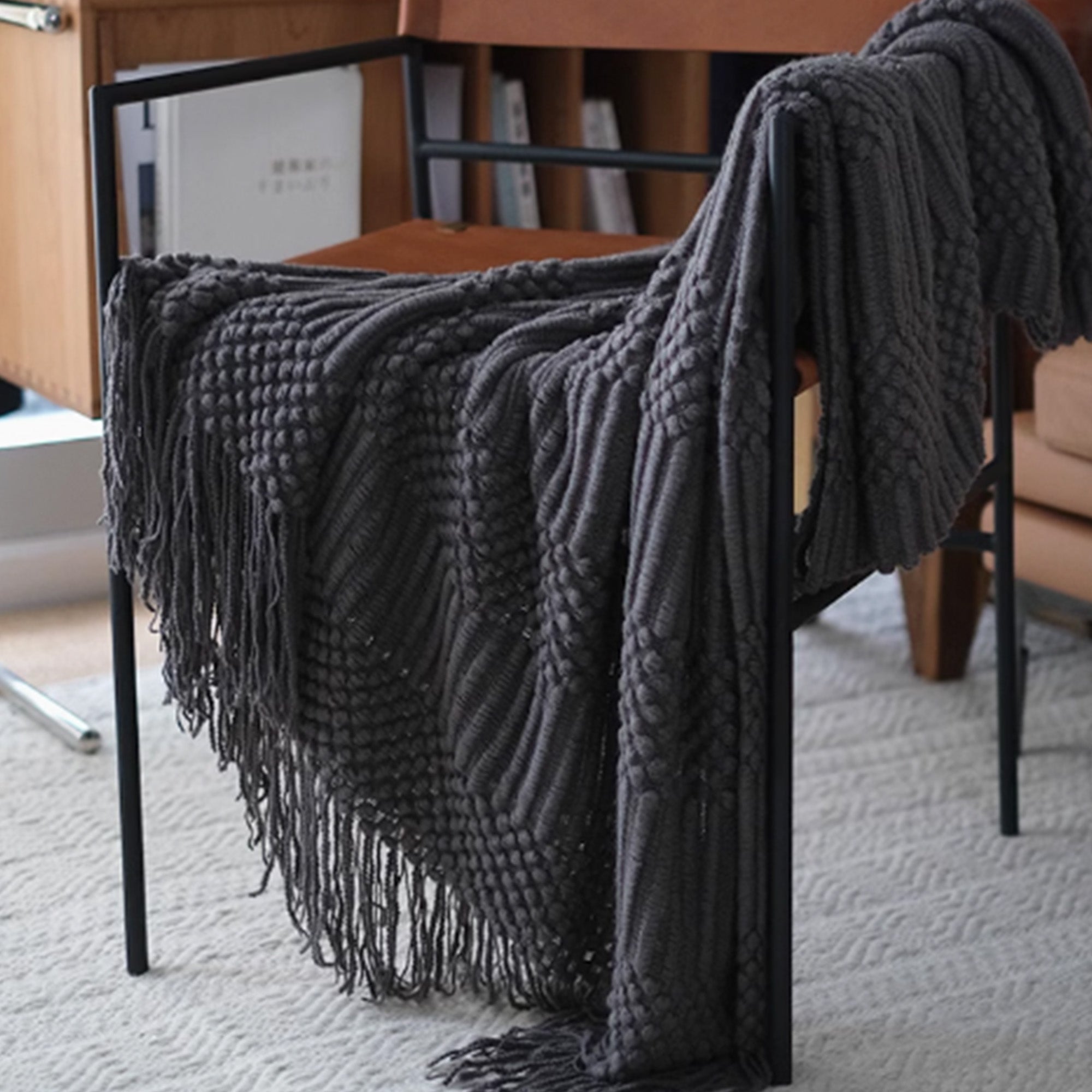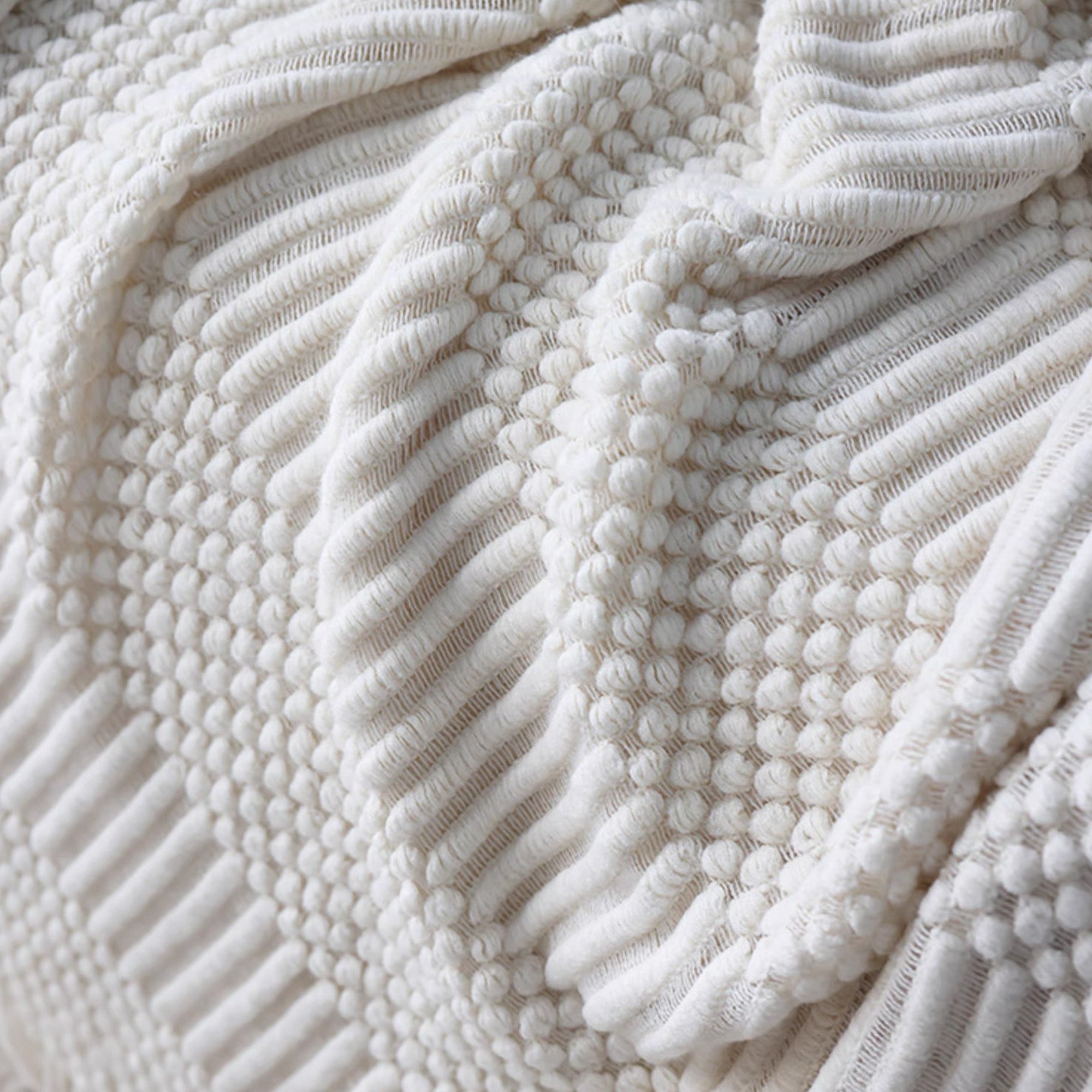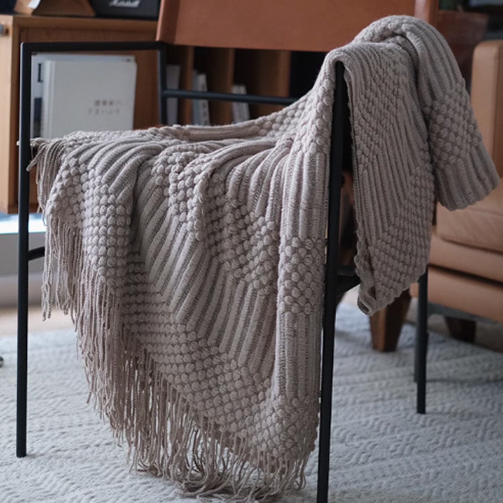 Verleihen Sie Ihrem Zuhause mit unserer strukturierten Fransen-Wohndecke einen Hauch von Bohème-Charme. Diese kuschelige Decke mit ihrem aufwendigen geometrischen Strickmuster und der angenehmen Haptik ist perfekt zum Einkuscheln oder als stilvolles Accessoire für Ihren Lieblingssessel. Die zarten Fransen unterstreichen ihre lässige Eleganz und machen sie zur idealen Wahl für eine warme und einladende Atmosphäre in jedem Raum.