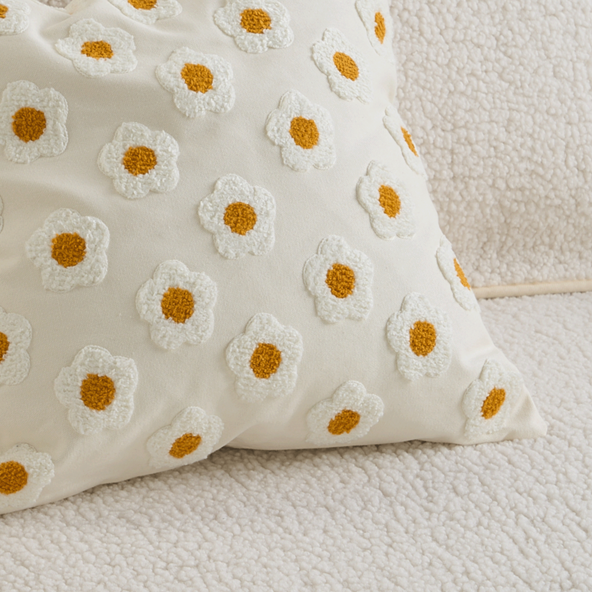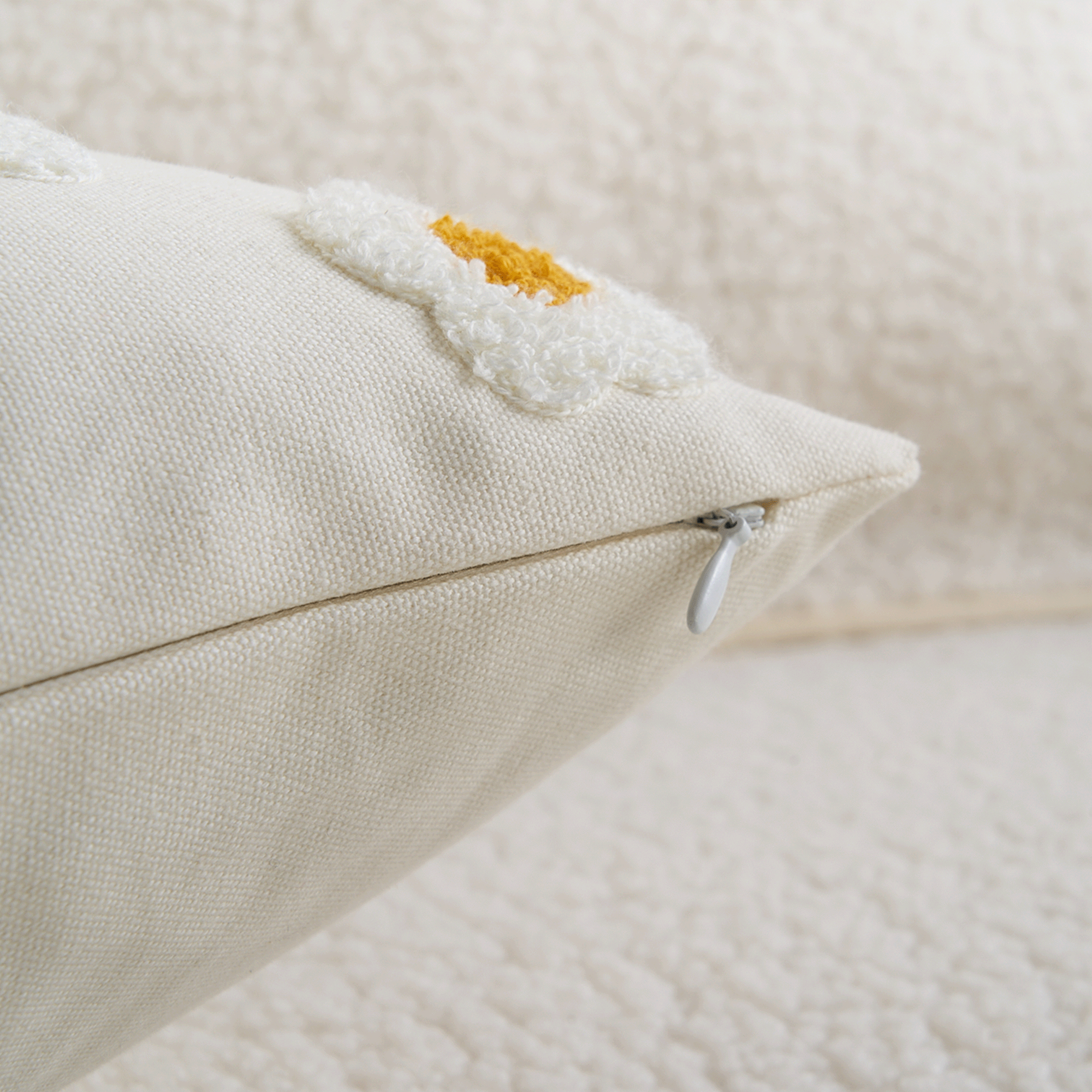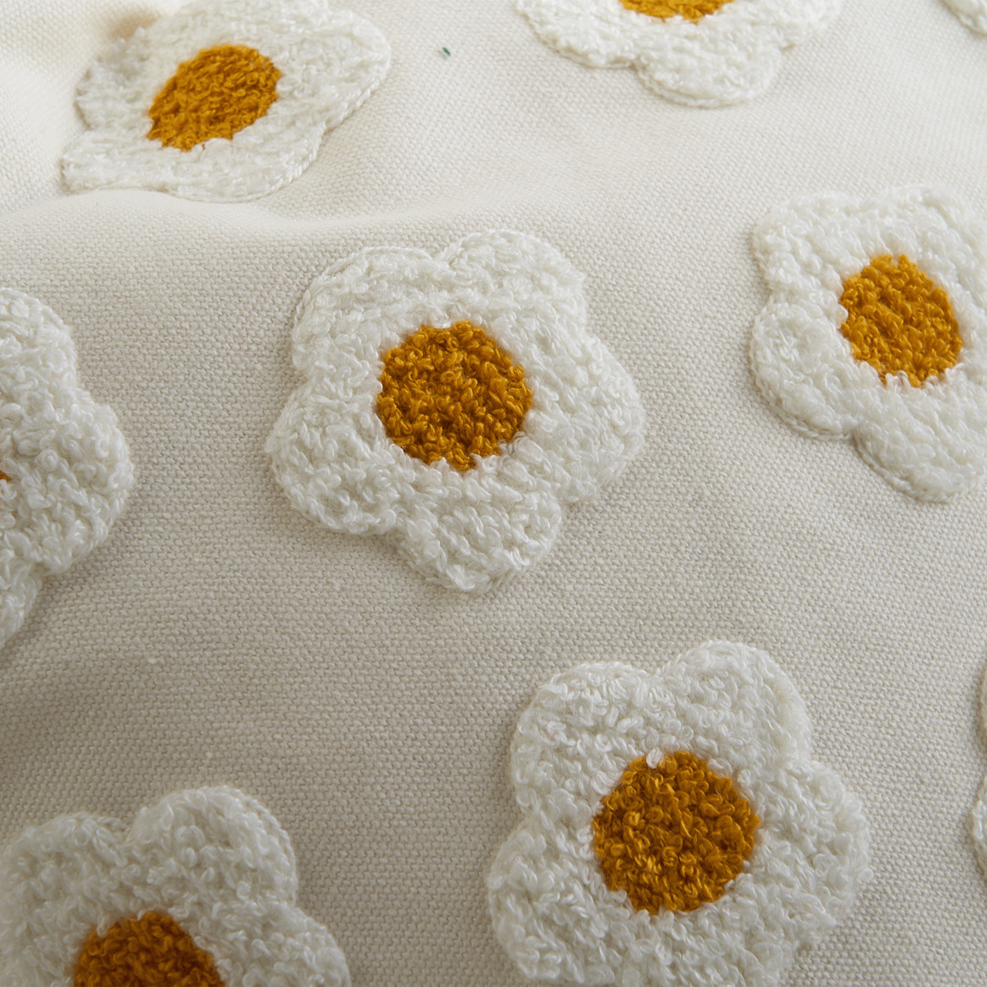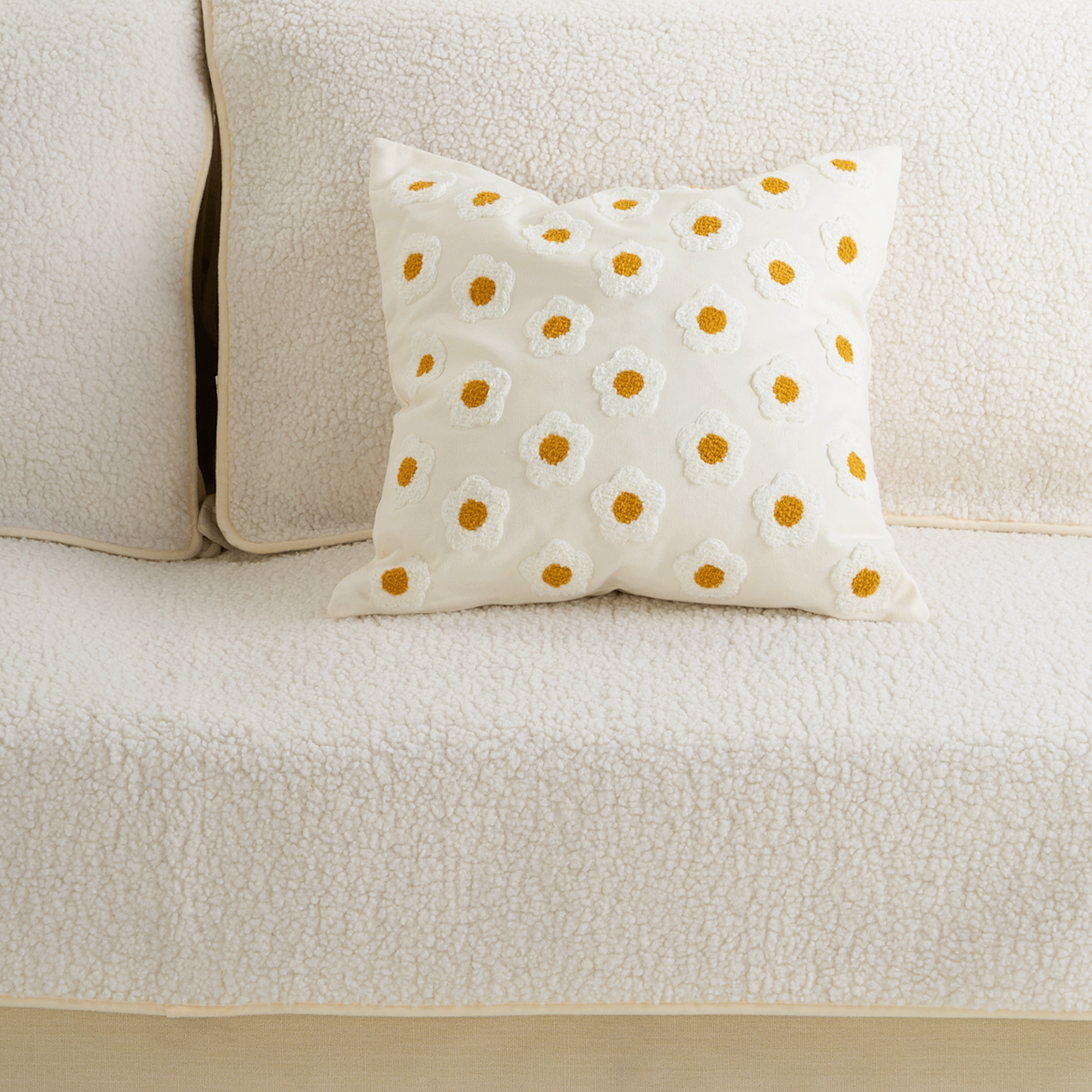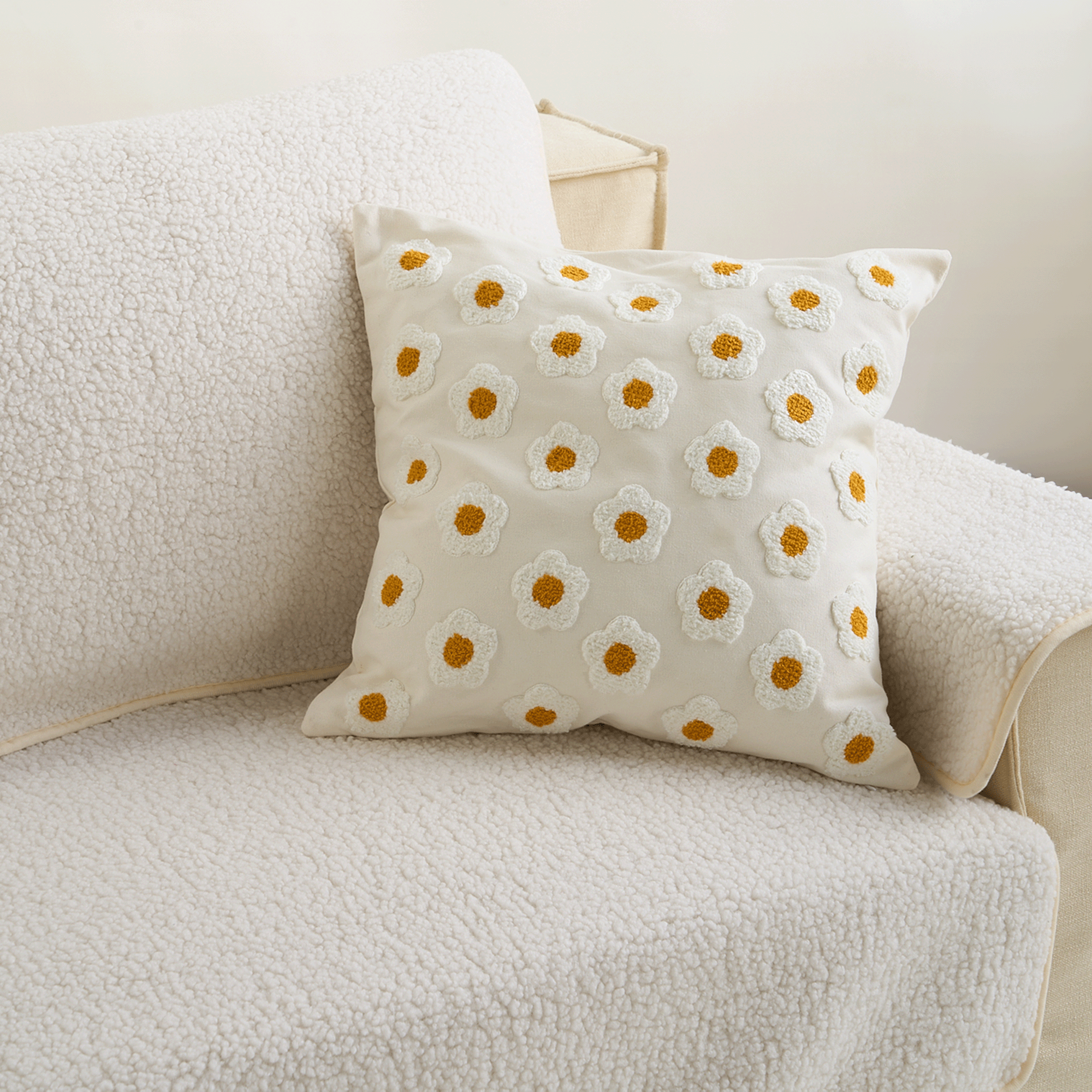 Tauchen Sie ein in eine Oase der Ruhe mit dem Sofakissen „Daisy Dreams“, wo sich jede Umarmung wie ein Spaziergang durch ein Blumenmeer anfühlt. Dieses Kissen ist mehr als nur Dekoration; es ist ein haptisches Erlebnis, das mit seiner weichen Haptik und angenehmen Textur beruhigt. Stellen Sie sich Blütenblätter auf Ihrer Haut vor – ein einzigartiges Sinneserlebnis, das gleichzeitig als charmanter Stressabbau dient. Verziert mit lebendigen, dreidimensionalen Gänseblümchenstickereien, bringt es die Frische des Frühlings in jeden Raum. Es ist wie ein gemütlicher Strauß für Ihr Sofa und zaubert ein blühendes Gänseblümchenparadies direkt in Ihr Zuhause.