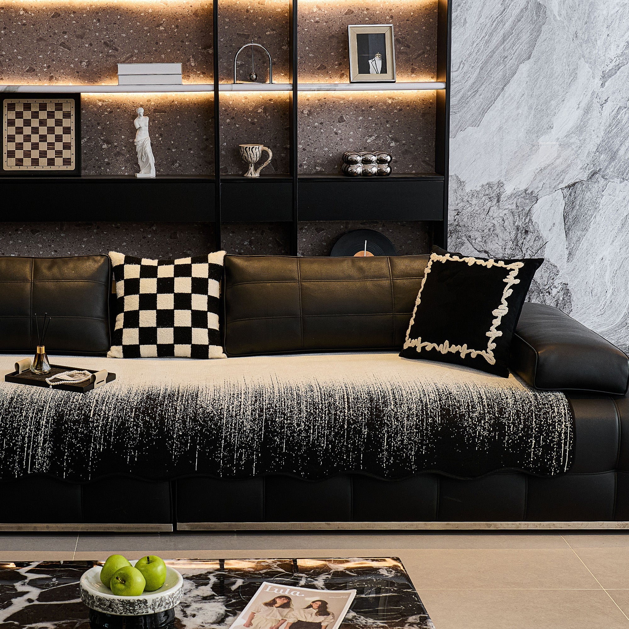 Mit seinem raffinierten Farbverlaufsmuster vereint dieser Bezug zeitgenössische Eleganz mit behaglichem Winterkomfort – und ist damit ein perfektes Statement-Piece für stilvolle, designorientierte Wohnungen.